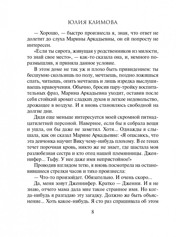 Дженнифер живет в семье родственников, а это не те люди, которые станут искренне заботиться о чужом ребенке. К тому же их беспокоит тайна рождения девочки. Кто ее отец? Где он? И почему мать дала ей такое странное имя? Оказывается, на эти вопросы может ответить старая няня, и жизнь Дженни кардинально меняется. Собрав вещи, она едет к отцу, в дом, где добро и зло переплетаются, а любовь не имеет права на ошибку…