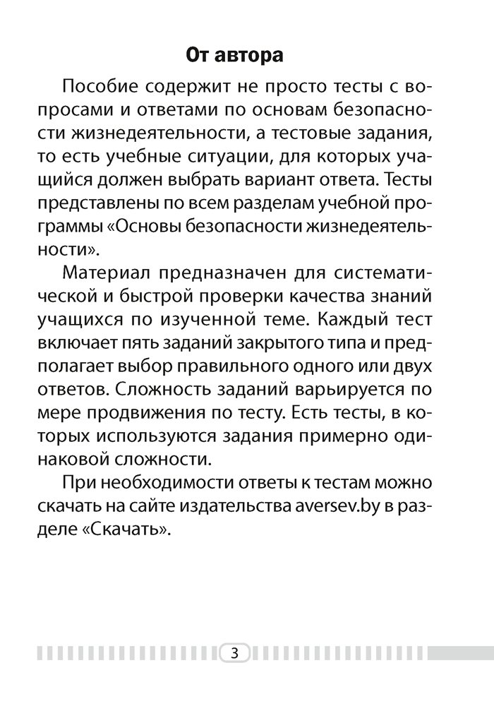 В пособии представлены тесты по всем разделам учебной программы «Основы безопасности жизнедеятельности». Материал предназначен для систематической и быстрой проверки качества знаний. Каждый тест включает пять заданий, расположенных от простого к сложному.