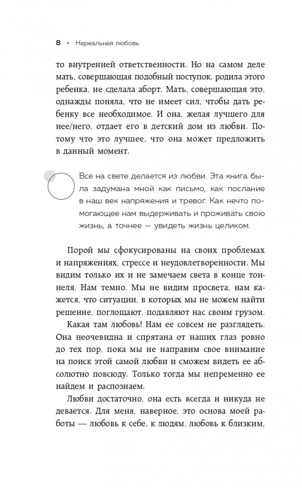 «Нереальная любовь» — результат ее многочисленных исследований на тему отношений. За 15 лет работы системным и провокативным психотерапевтом она провела тысячи сессий с парами, супругами и точно знает, как избавить вас от страха и блокирующих убеждений, которые мешают обрести счастье и подходящего партнера.