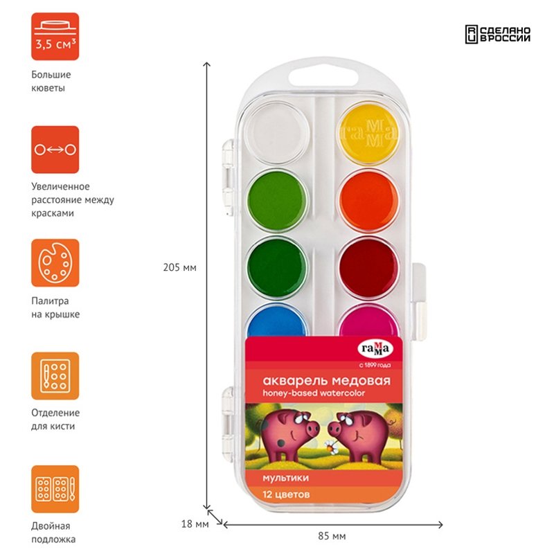 Медовая акварель серии "Мультики" разработана с учетом рекомендаций педагогов. Идеально подходит для занятий рисованием в детском саду, школе и дома. Яркие чистые цвета развивают фантазию и интерес к творчеству. Акварель безопасна для детей. Удобный пластиковый пенал, крышка плотно фиксируется и служит палитрой для смешивания красок. Кюветы с высокими бортиками и увеличенным расстоянием между красками предназначены для удобства в работе детей. Акварель легко смывается с рук и отстирывается с одежды.