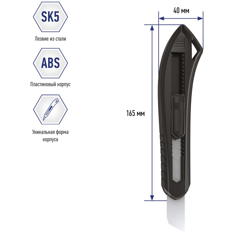 Серия "Razzor 100". Нож канцелярский с ручной системой фиксации лезвия push-lock. Корпус ножа выполнен из высококачественного ABS пластика. Комплектуется износостойким лезвием из стали SK5. Ширина лезвия - 18 мм. Индивидуальная упаковка - пакет с европодвесом. Доступен в трех цветах: желтый, черный, синий.