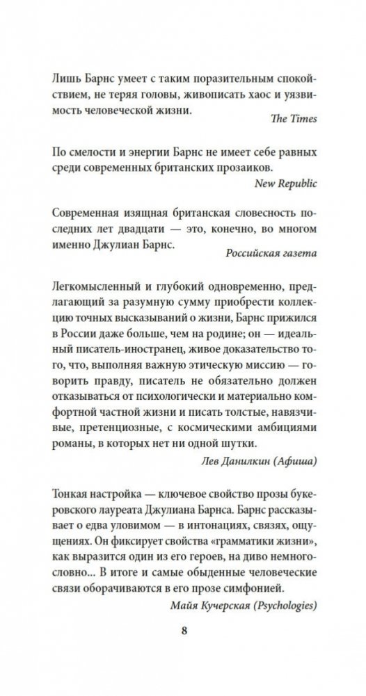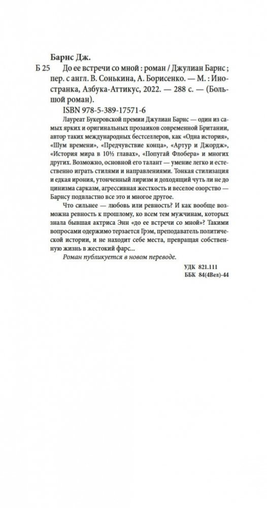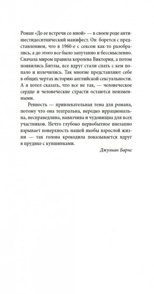 Лауреат Букеровской премии Джулиан Барнс — один из самых ярких и оригинальных прозаиков современной Британии, автор таких международных бестселлеров, как «Одна история», «Шум времени», «Предчувствие конца», «Артур и Джордж», «История мира в 10½ главах», «Попугай Флобера» и многих других. Возможно, основной его талант — умение легко и естественно играть стилями и направлениями. Тонкая стилизация и едкая ирония, утонченный лиризм и доходящий чуть ли не до цинизма сарказм, агрессивная жесткость и веселое озорство — Барнсу подвластно все это и многое другое. Что сильнее — любовь или ревность? И как вообще возможна ревность к прошлому, ко всем тем мужчинам, которых знала бывшая актриса Энн «до ее встречи со мной»? Такими вопросами одержимо терзается Грэм, преподаватель политической истории, и не находит себе места, превращая собственную жизнь в жестокий фарс... Роман публикуется в новом переводе.