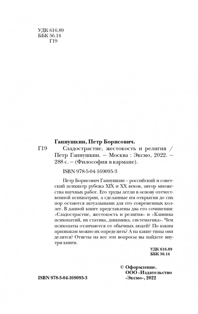 Петр Борисович Ганнушкин – российский и советский психиатр рубежа XIX и XX веков, автор множества научных работ. Его труды легли в основу отечественной психиатрии, а сделанные им открытия до сих пор остаются актуальными для его современных коллег. В данной книге представлены два его сочинения: "Сладострастие, жестокость и религия" и "Клиника психопатий, их статика, динамика, систематика". Чем психопаты отличаются от обычных людей? По каким признакам можно их определить? А на какие типы они делятся? Ответы на все эти вопросы вы найдете внутри книги.