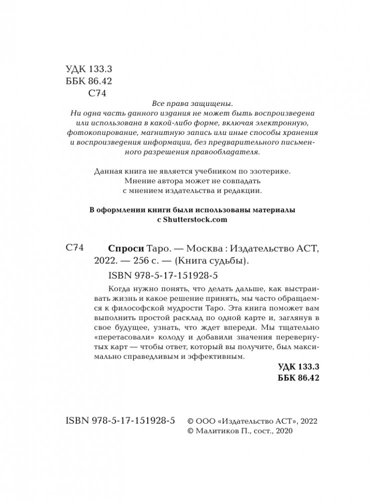 Когда нужно понять, что делать дальше, как выстраивать жизнь и какое решение принять, мы часто обращаемся к философской мудрости Таро. Эта книга поможет вам выполнить простой расклад по одной карте и, заглянув в свое будущее, узнать, что ждет впереди. Мы тщательно "перетасовали" колоду и добавили значения перевернутых карт — чтобы ответ, который вы получите, был максимально справедливым и эффективным.
