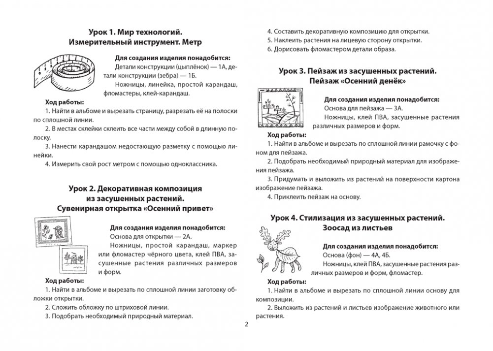 Альбом заданий содержит набор материалов для создания изделий на каждом из 34 уроков, предусмотренных учебной программой. В издании есть пронумерованные листы бумаги и картона, выкройки, трафареты, шаблоны, развёртки. В текстовой части представлены тематика уроков, общий вид изделий, последовательность их изготовления и список необходимых материалов и инструментов.