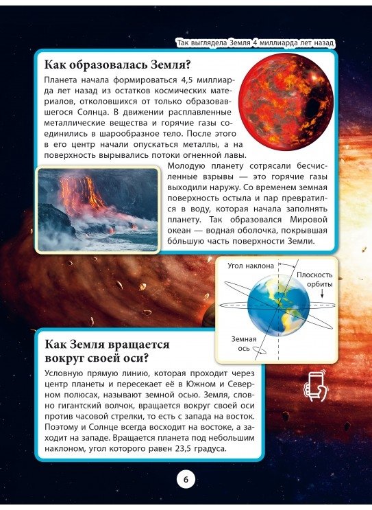 Красочно иллюстрированное издание поможет больше узнать о прошлом и настоящем планеты. Читатель узнает, как образовалась Земля и как она изменялась на протяжении миллиардов лет, как здесь зародилась и развивалась жизнь. Технология дополненной реальности позволяет совершить виртуальное путешествие по всем континентам, посетить величественные горы, увидеть огнедышащие вулканы, загадочные джунгли, таинственные пещеры и гигантские ледники.