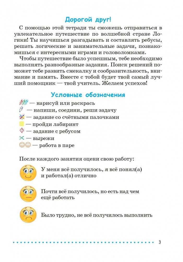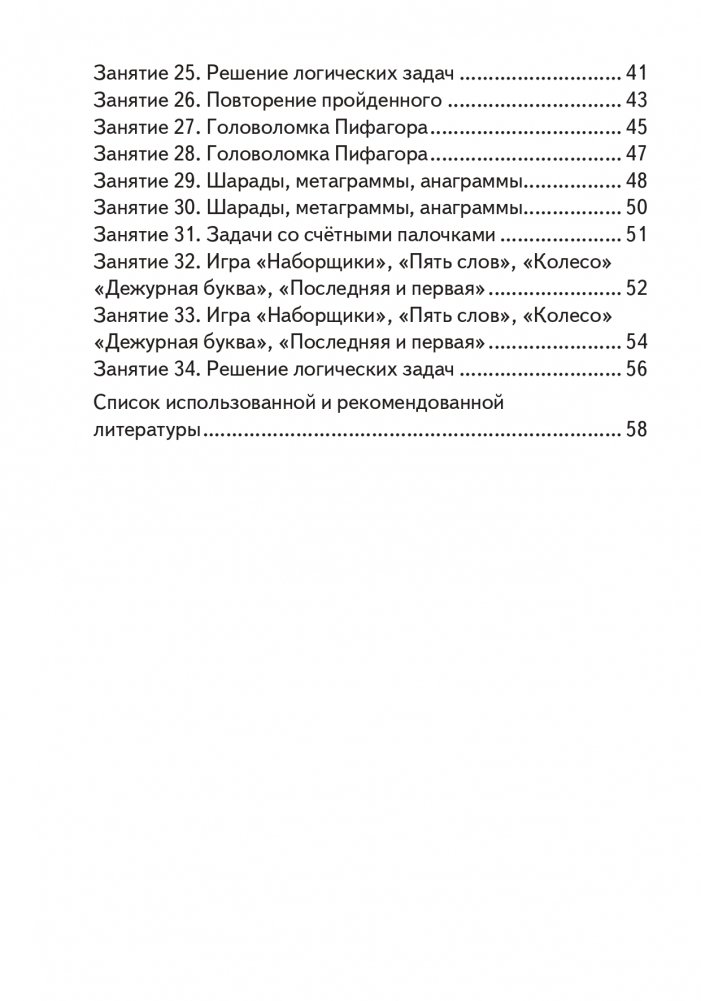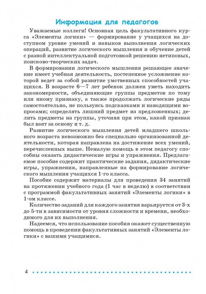 Пособие содержит материалы для проведения 34 занятий на протяжении учебного года (1 час в неделю) в соответствии с программой факультативных занятий "Элементы логики" в 1-ом классе. Предлагаемые задания помогут развить логическое мышление, наблюдательность и смекалку, внимание и память.
