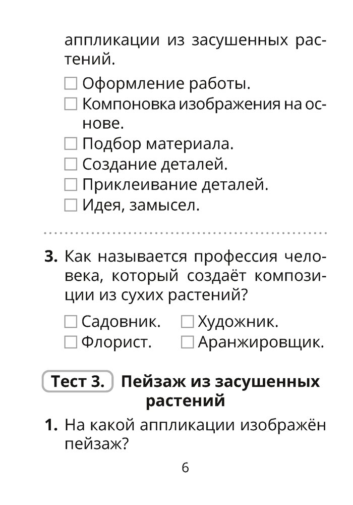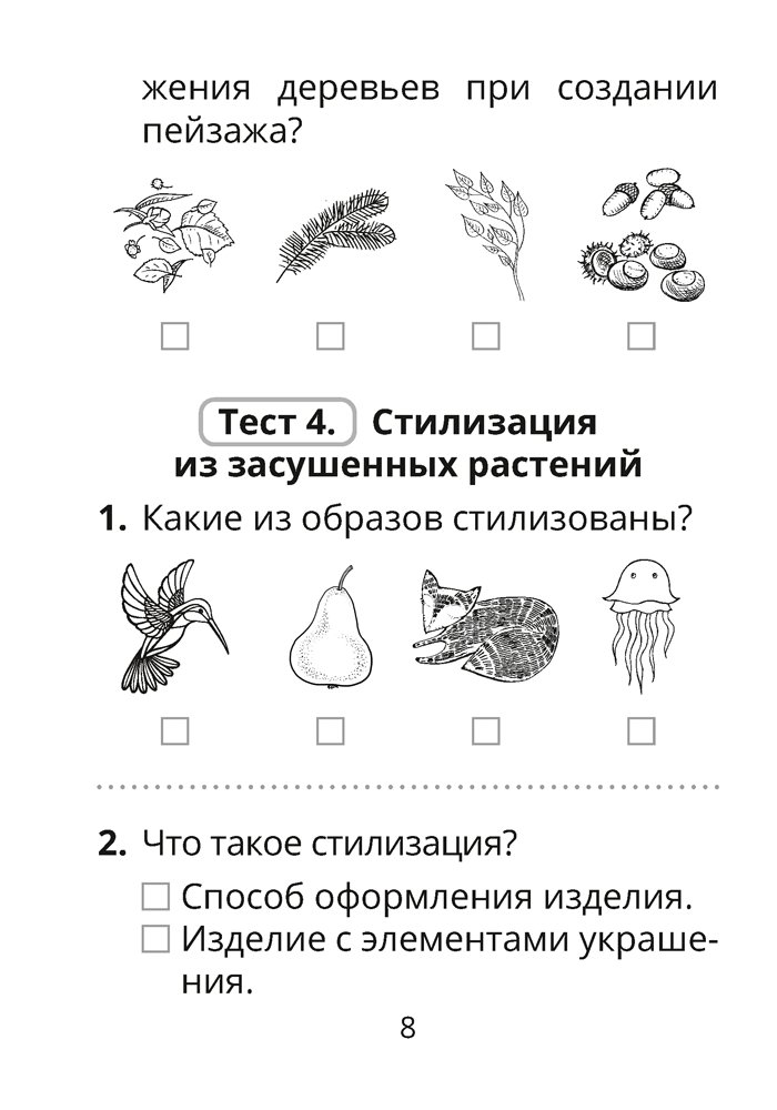 Пособие содержит тесты по двум предметам — трудовому обучению и изобразительному искусству. Тесты могут быть использованы на уроках для знакомства с новыми темами, закрепления полученных знаний, проверки уровня усвоения материала учащимися, обобщения и систематизации изученного.