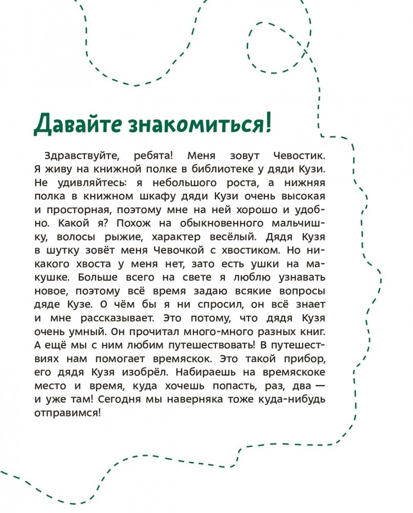Чевостик вместе с дядей Кузей совершает удивительные путешествия в мир наук: физики, химии, астрономии, анатомии, геологии и других. Он рассказывает детям о великих географических открытиях, покорении космоса и волшебных химических превращениях.