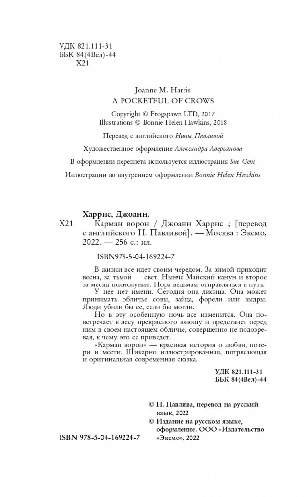 «Карман ворон» — красивая история о любви, потери и мести. Потрясающая и оригинальная современная сказка от Джоанн Харрис, автора знаменитого романа «Шоколад», который получил экранизацию с Жюльетт Бинош и Джоннм Деппом в главных ролях. Сегодня книги Харрис любимы миллионами читателей во всем мире. Ее проза поэтична, а сюжеты необычны.