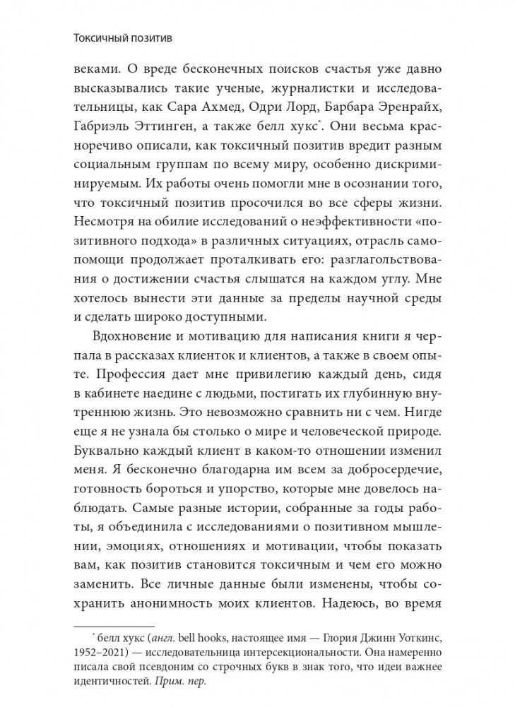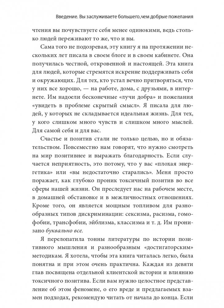 В этой книге востребованный психотерапевт Уитни Гудман делится результатами последних исследований, которые показывают, насколько эта токсичная позитивность вредна для нас и наших отношений, рассказывает, почему важно наконец признать свои настоящие эмоции, и описывает стратегии, которые позволят справиться с ними. Вернув себе разрешение чувствовать, вы сможете стать самими собой. В книге много примеров и историй из практики. Затрагиваются темы шейминга, восприятия тела, любви к себе, самопомощи.