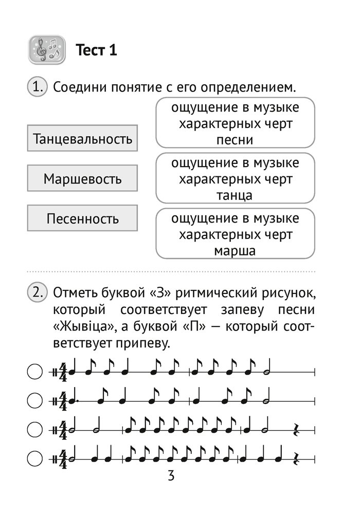 Тесты разработаны в соответствии с учебной программой и учебным пособием «Музыка» для 3 класса. Разноуровневые задания предназначены для повторения, обобщения и систематизации изученного, а также для активизации и закрепления знаний учащихся. В пособии размещены QR-коды, с помощью которых третьеклассники смогут послушать фрагменты музыкальных произведений.