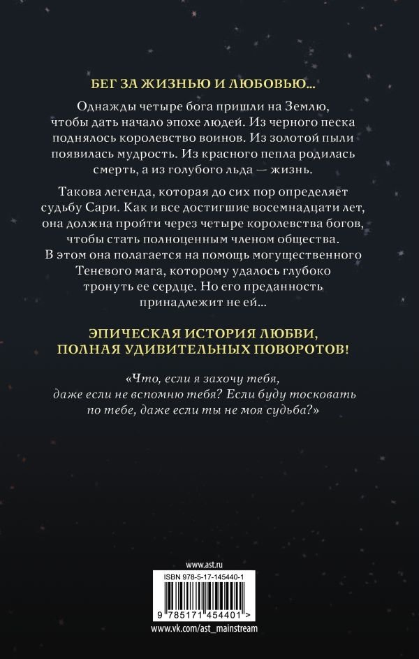 Такова легенда, которая до сих пор определяет судьбу Сари. Как и все достигшие восемнадцати лет, она должна пройти через четыре королевства богов, чтобы стать полноценным членом общества. В этом она полагается на помощь могущественного Теневого мага, которому удалось глубоко тронуть ее сердце. Но его преданность принадлежит не ей…