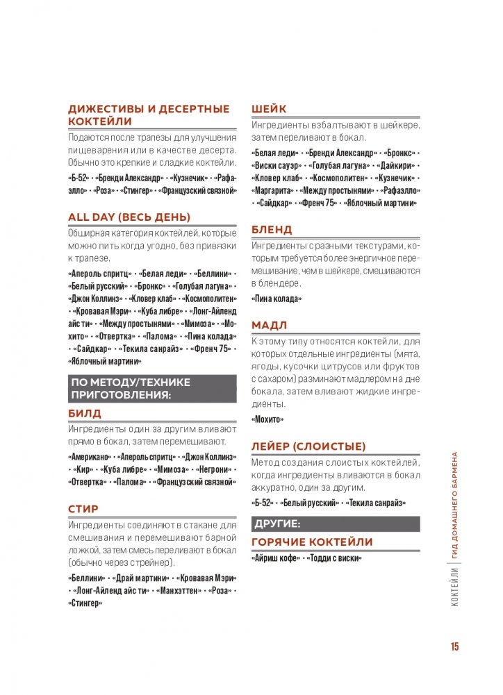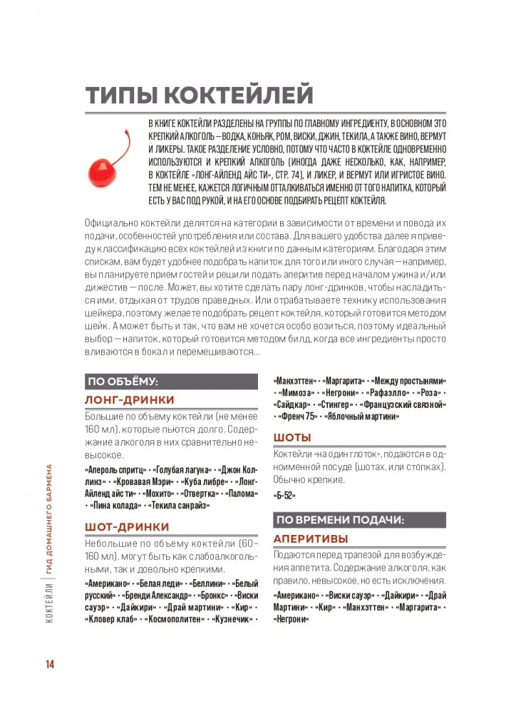 От брутального «Белого русского» до женственной «Мимозы», от игривого «Кузнечика» до прямолинейного «Негрони», от тропической «Пина колады» до горячего кофе по-ирландски — в книге приведено около 40 классических рецептов, а также даны рекомендации по замене ингредиентов, поэтому в итоге количество рецептов гораздо больше. И напитки, которые по ним готовятся, подойдут абсолютно для любого повода, события или времени года.