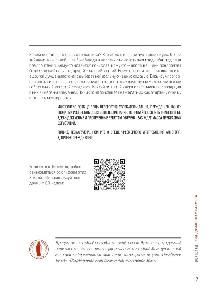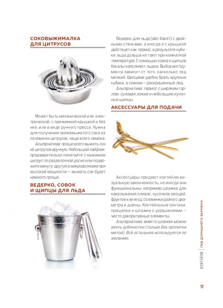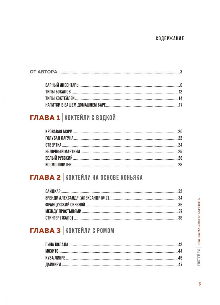 Главной идеей этой книги стала доступность и простота: как ингредиентов, так и посуды, и техник. Здесь нет сложных и трудновоспроизводимых коктейлей с редкими ликерами или дорогими марками спиртного. Рецепты собраны в главы по принципу основного ингредиента, ведь именно он выступает в роли «идейного вдохновителя» будущего коктейля, к нему подбираются все остальные дополнения. Водка, коньяк, ром, виски, джин, текила, вино и вермуты, ликеры — базовые элементы барной классики — станут отправной точкой при выборе коктейля, который вы решите приготовить.