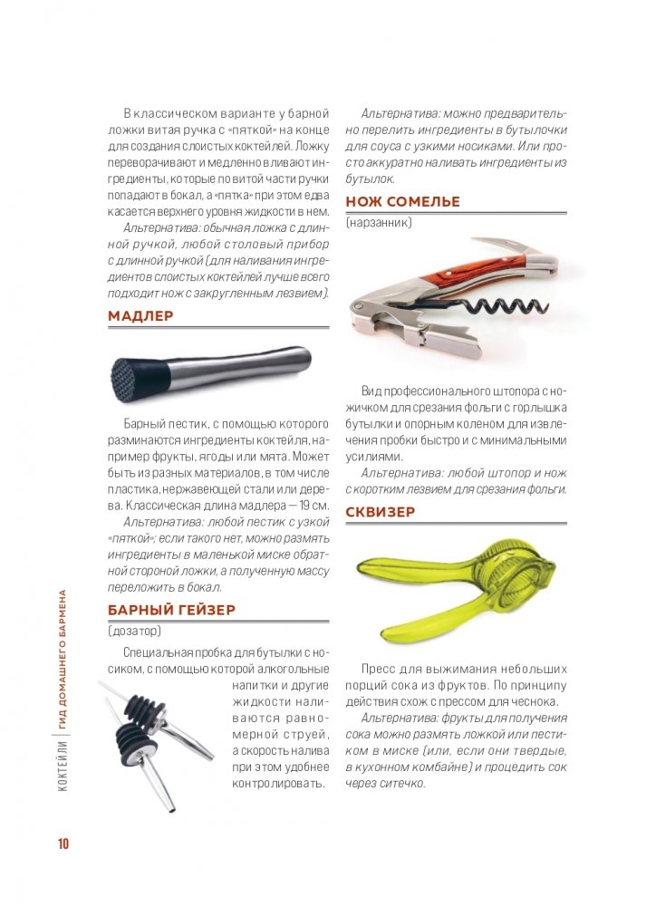 Помимо рецептов, в книге собрана интересная и занимательная информация о коктейлях, приводится описание барного инвентаря, основных типов бокалов и напитков, а также список оптимальной комплектации домашнего бара без излишеств, то есть, разумной и не слишком обременительной для вашего бюджета.