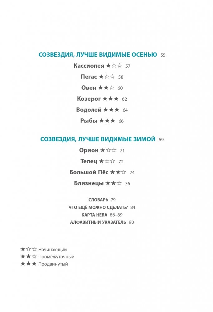 С давних времён люди давали волю воображению и видели в скоплениях звёзд различные фигуры и давали им имена. Со временем наука собрала разные представления в одно целое – и теперь у нас есть цельная и красивая картина неба! Давай посмотрим на неё! С этой книгой ты на практике научишься находить и распознавать простые и сложные созвездия, выяснишь, как рисунок звёздного неба зависит от сезонов года, а также узнаешь, на каких мифах и легендах основаны названия созвездий. Словарь и алфавитный указатель в конце книги помогут тебе запомнить имена всех звёзд!