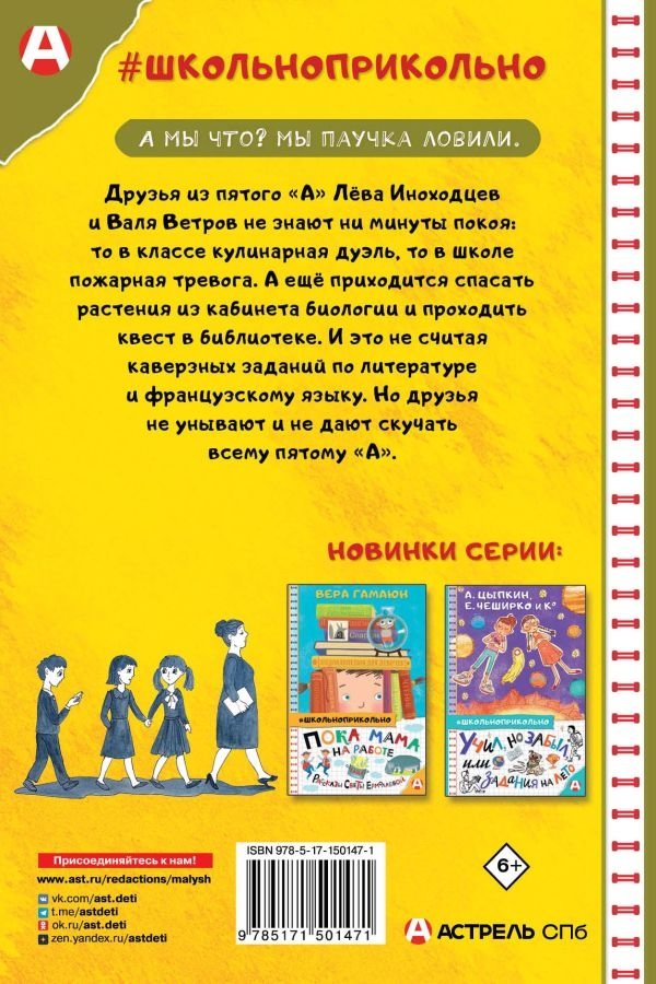 Друзья из пятого "А" Лёва Иноходцев и Валя Ветров не знают ни минуты покоя: то в классе кулинарная дуэль, то в школе пожарная тревога. А ещё приходится спасать растения из кабинета биологии и проходить квест в библиотеке. И это не считая каверзных заданий по литературе и французскому языку. Но друзья не унывают и не дают скучать всему пятому "А".