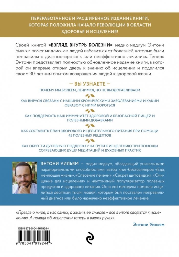Своей книгой "Взгляд внутрь болезни" медик-медиум Энтони Уильям помог миллионам людей избавиться от проблем со здоровьем, против которых официальная медицина оказалась бессильна. Теперь Энтони возвращается с полностью обновленным и дополненным изданием книги, в которой он впервые открыл дверь к знанию об исцелении и поделился своим 30-летним опытом возвращения людей к здоровой и полноценной жизни.