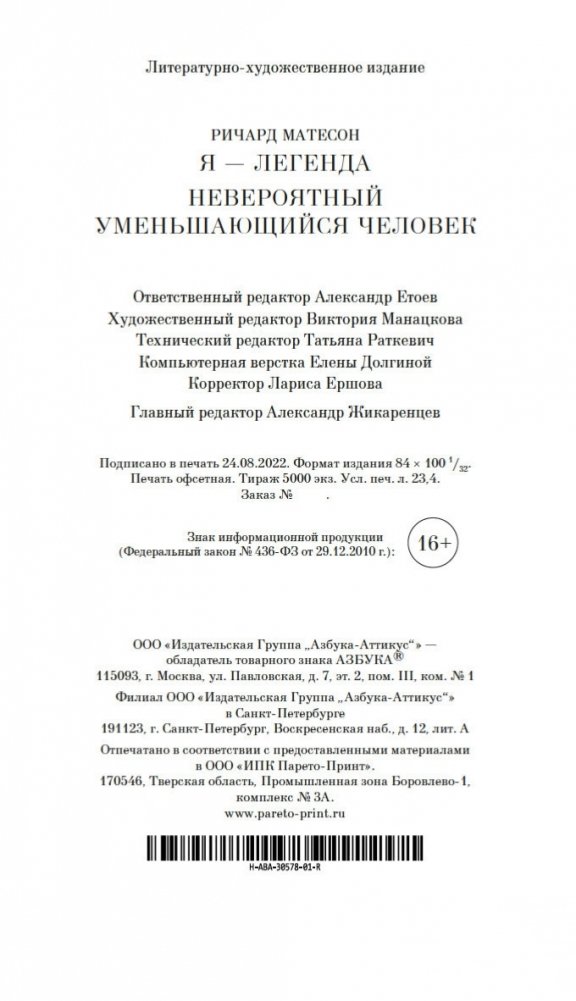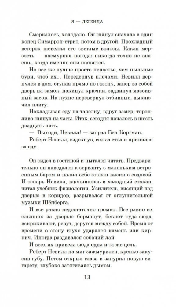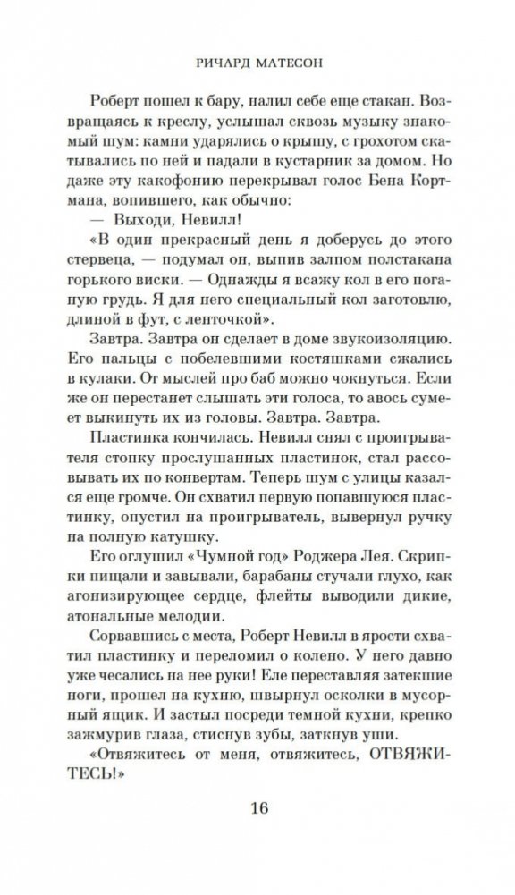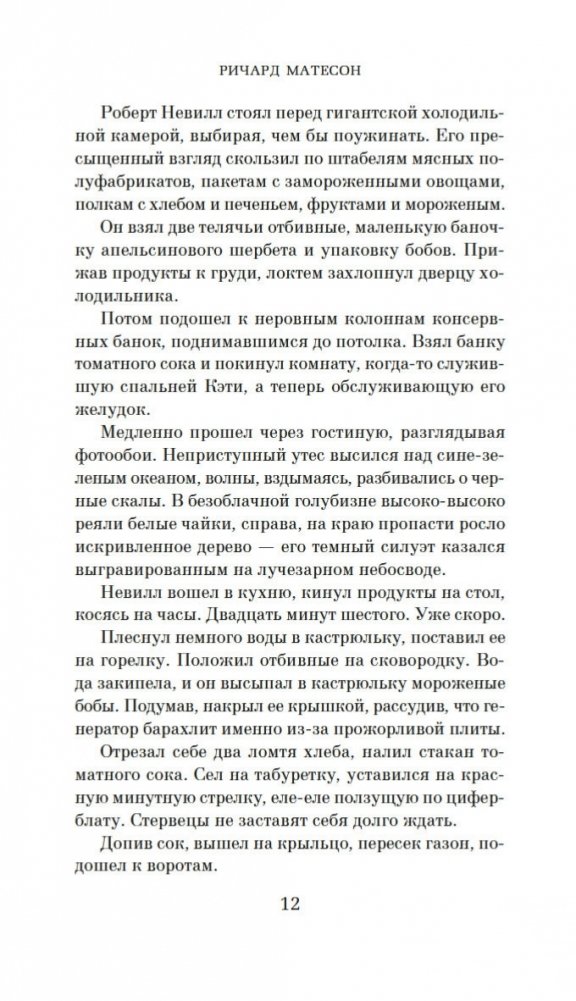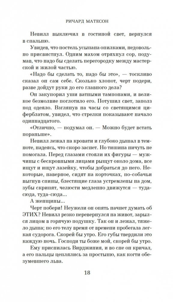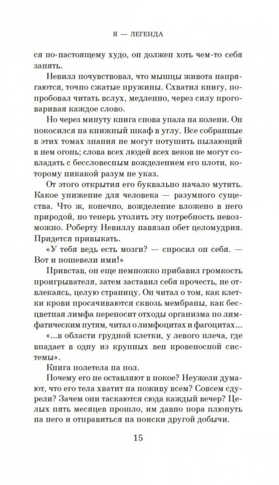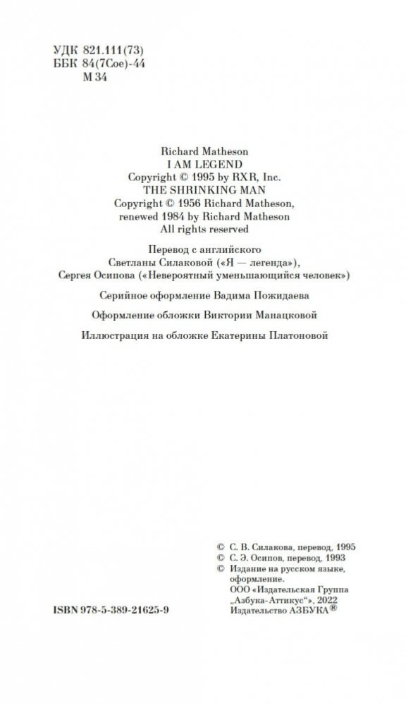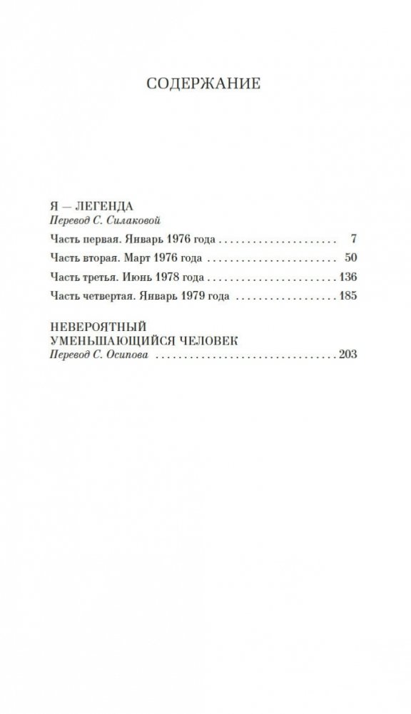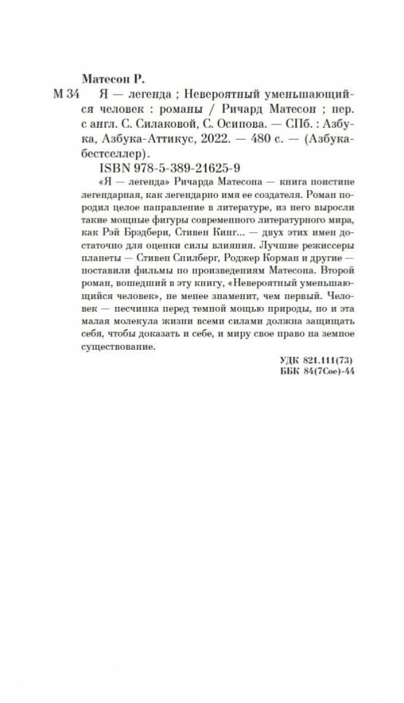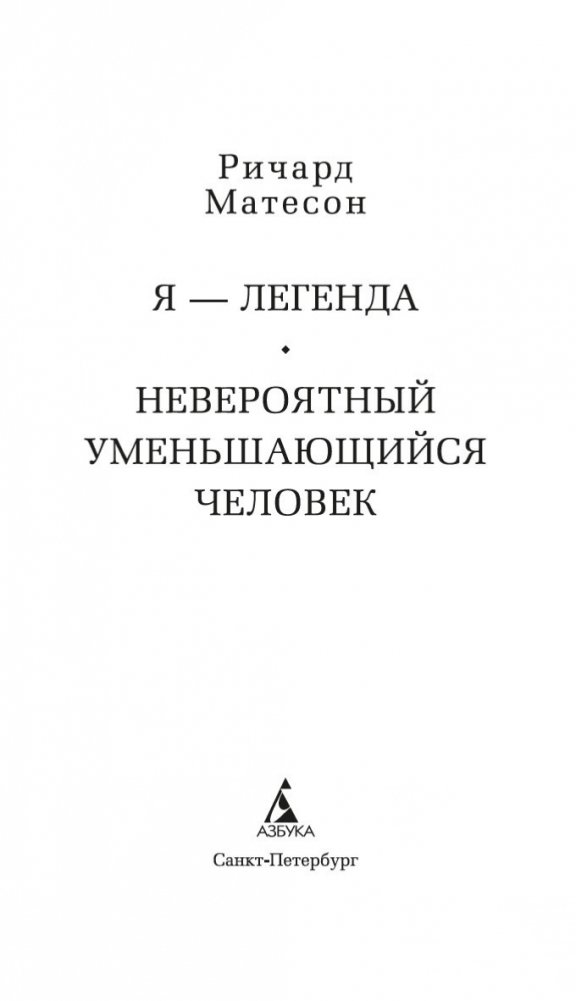 «Я — легенда» Ричарда Матесона — книга поистине легендарная, как легендарно имя ее создателя. Роман породил целое направление в литературе, из него выросли такие мощные фигуры современного литературного мира, как Рэй Брэдбери, Стивен Кинг… — двух этих имен достаточно для оценки силы влияния. Лучшие режиссеры планеты — Стивен Спилберг, Роджер Корман и другие — поставили фильмы по произведениям Матесона. Второй роман, вошедший в эту книгу, «Невероятный уменьшающийся человек», не менее знаменит, чем первый. Человек — песчинка перед темной мощью природы, но и эта малая молекула жизни всеми силами должна защищать себя, чтобы доказать и себе, и миру свое право на земное существование.