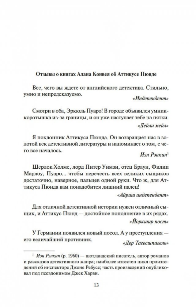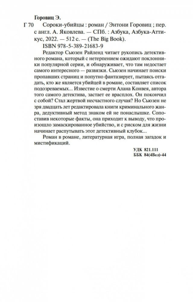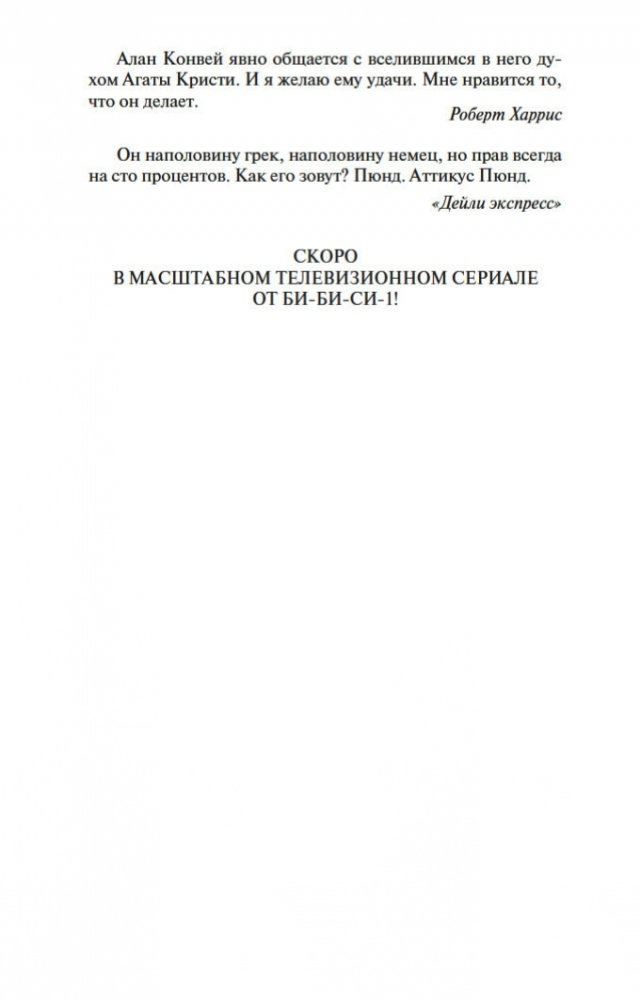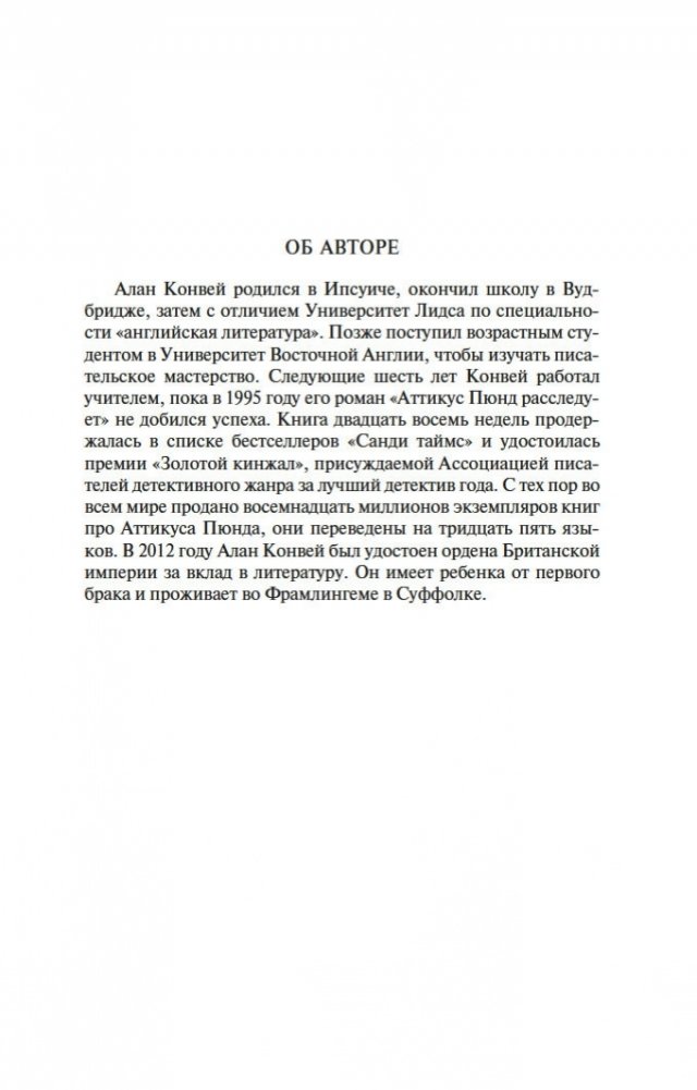 Редактор Сьюзен Райленд читает рукопись детективного романа, который с нетерпением ожидают поклонники популярной серии, и обнаруживает, что там недостает самого интересного — развязки. Сьюзен начинает поиски пропавших страниц и попутно фантазирует, пытаясь отгадать, кто же является убийцей в романе, составляет список подозреваемых… Известие о смерти Алана Конвея, автора того самого детектива, застает ее врасплох. Он покончил с собой? Стал жертвой несчастного случая? Но Сьюзен не зря двадцать лет редактировала книги криминального жанра, дедуктивный метод знаком ей не понаслышке. Сопоставив некоторые факты, она приходит к выводу, что произошло замаскированное убийство, и с риском для жизни начинает распутывать этот детективный клубок... Роман в романе, литературная игра, полная загадок и мистификаций.