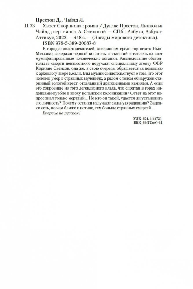 В городке золотоискателей, затерянном среди гор штата Нью-Мексико, задержан черный копатель, пытавшийся извлечь на свет мумифицированные человеческие останки. Расследование обстоятельств смерти неизвестного поручают специальному агенту ФБР Коринне Свенсон, она же, в свою очередь, обращается за помощью к археологу Норе Келли. Вид мумии свидетельствует о том, что этот человек умер в страшных мучениях, а рядом с телом обнаружен старинный золотой крест, отделанный драгоценными камнями. А если это сокровище из того легендарного клада, что спрятан в горах индейцами-пуэбло в эпоху испанской колонизации? Ответ на этот вопрос знал только мертвый... Но кто он такой, удастся ли установить его личность? Почему останки излучают сильную радиацию? Зацепки есть, но чем ближе к истине, тем больше странных смертей... Впервые на русском!