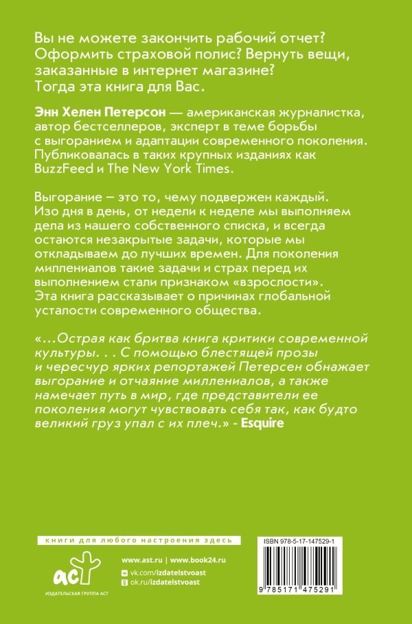 Энн Хелен Петерсон – американская журналистка, автор бестселлеров, эксперт в теме борьбы с выгоранием и адаптации современного поколения. Публиковалась в таких крупных изданиях как BuzzFeed и The New York Times.