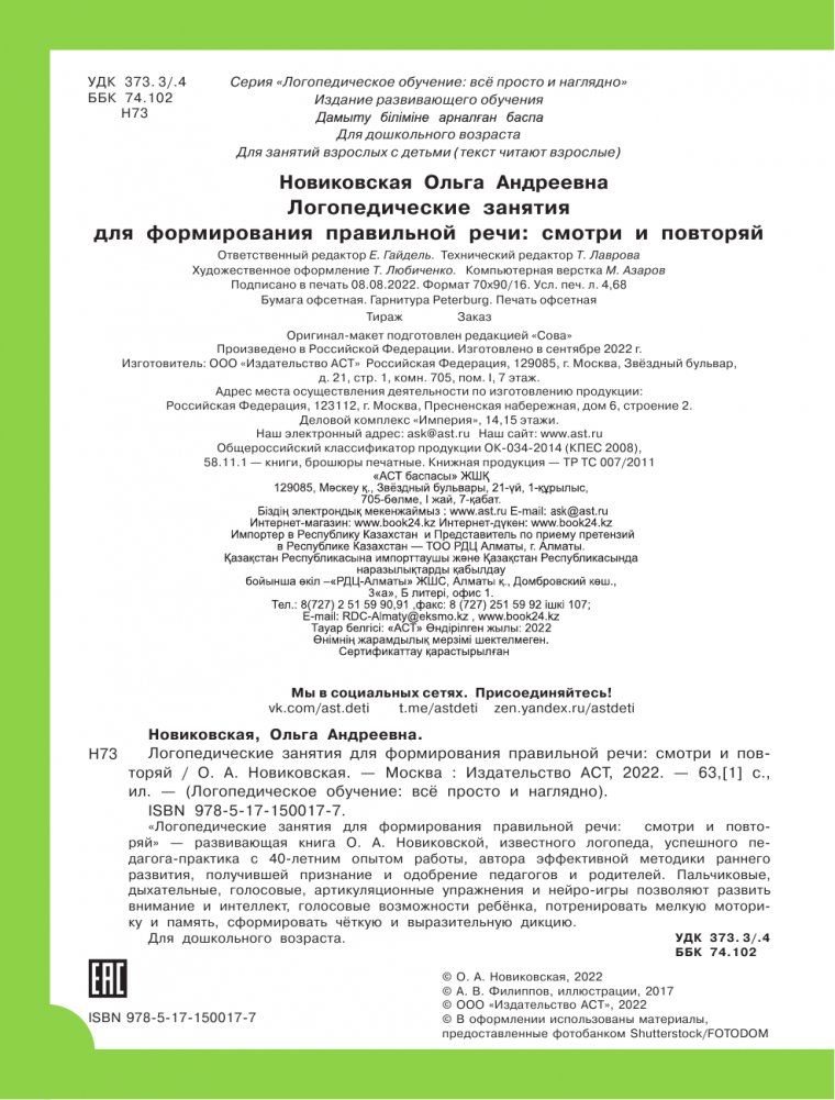 "Логопедические занятия для формирования правильной речи: смотри и повторяй" — развивающая книга О. А. Новиковской, известного логопеда, успешного педагога-практика с 40-летним опытом работы, автора эффективной методики раннего развития, получившей признание и одобрение педагогов и родителей. Пальчиковые, дыхательные, голосовые, артикуляционные упражнения и нейро-игры позволяют развить внимание и интеллект, голосовые возможности ребёнка, потренировать мелкую моторику и память, сформировать чёткую и выразительную дикцию.