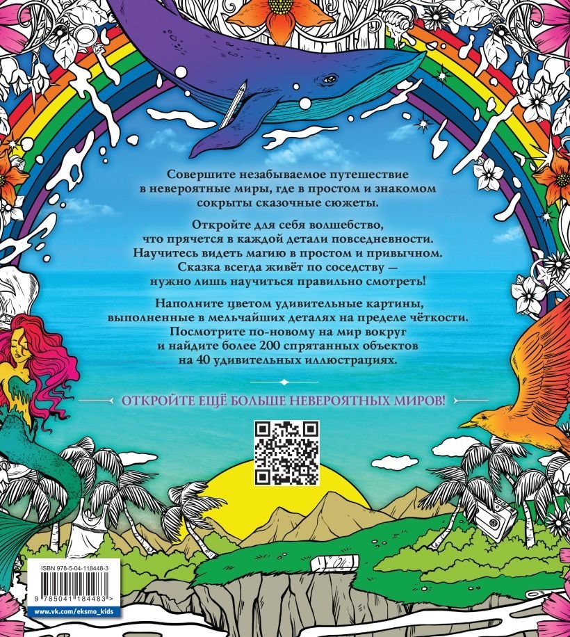 Понаблюдайте, как пространства реальные и фантазийные трансформируются, меняются и оживают в новых образах, поразительных деталях и тончайших линиях на пределе чёткости. Наполните цветом мир, где чудесным образом в реальном скрывается волшебное. Откройте для себя невидимые глазу вселенные. Раскрашивайте и ищите скрытые предметы — раскройте невероятную и прекрасную тайну спрятанных пространств и целых миров в привычном и знакомом.