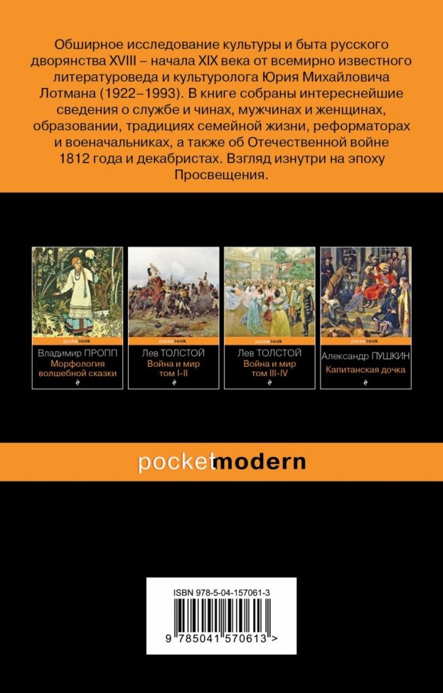 Обширное исследование культуры и быта русского дворянства XVIII — начала XIX века от всемирно известного литературоведа и культуролога Юрия Лотмана (1922—1993). В книге собраны интереснейшие сведения о людях и чинах, мужчинах и женщинах, образовании, традициях семейной жизни, реформаторах и военачальниках, а также об Отечественной войне 1812 года и декабристах. Взгляд изнутри на Эпоху Просвещения.