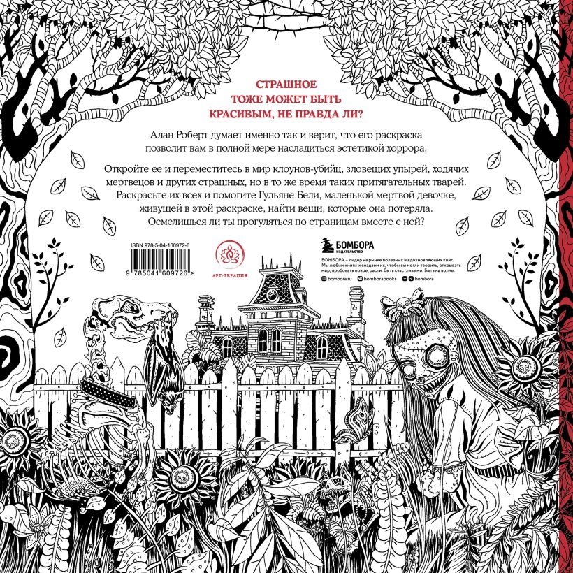 С раскраской от популярного художника и гитариста американской рок-группы Life of Agony Алана Роберта вы поймете, что страшное тоже может быть красивым! На ее страницах вас ждут клоуны-убийцы, ходячие мертвецы, зловещие упыри и другие мерзкие твари. Однако художник изобразил их в своеобразном авторском стиле, не лишенном притягательности! Его рисунки одновременно ужасные и прекрасные, зловещие и захватывающие. Раскрасьте их все и проникнитесь эстетикой хоррора!