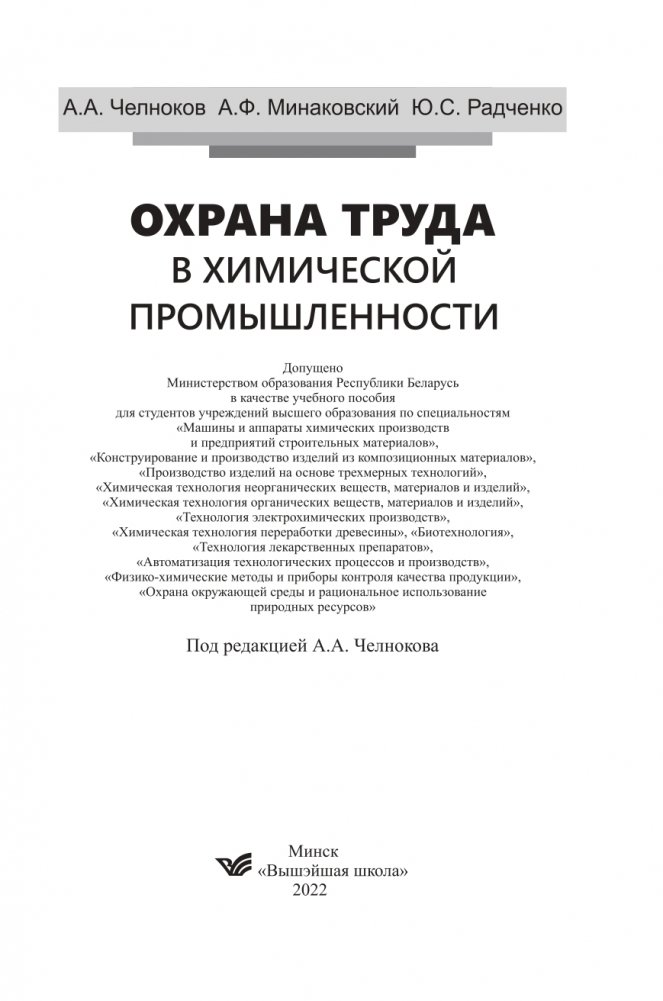 Для студентов учреждений высшего образования, также будет полезно слушателям системы повышения квалификации, руководителям и специалистам по охране труда предприятий и организаций, перерабатывающих химическое сырье и материалы.