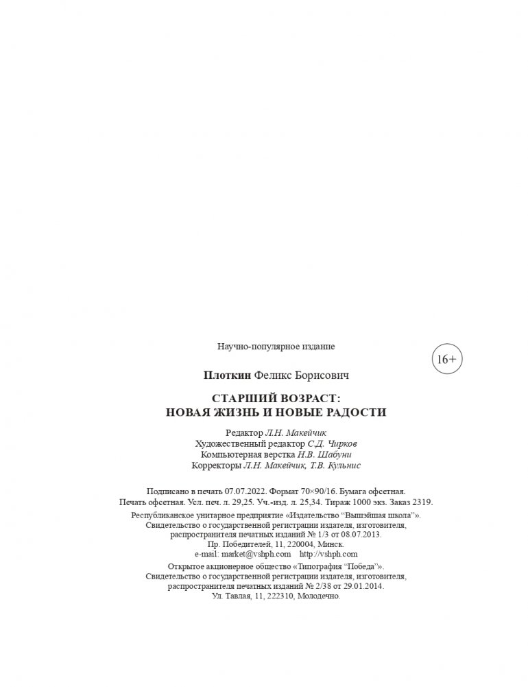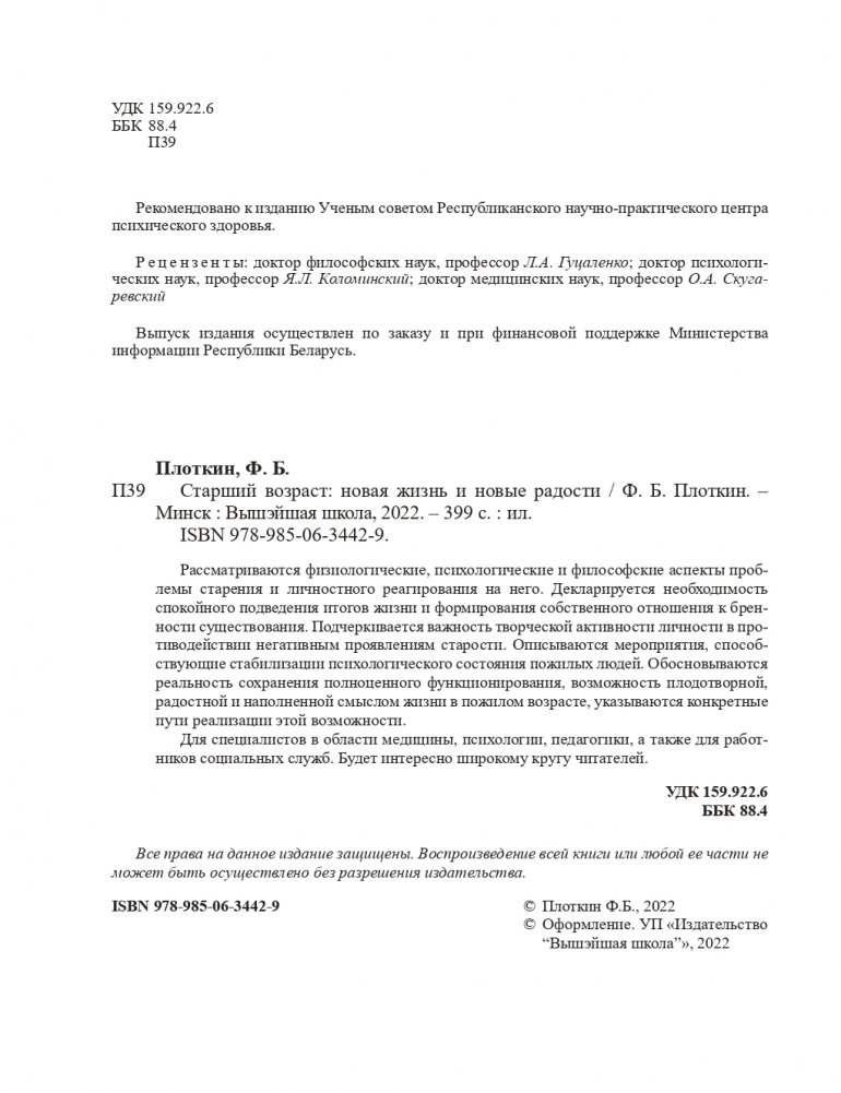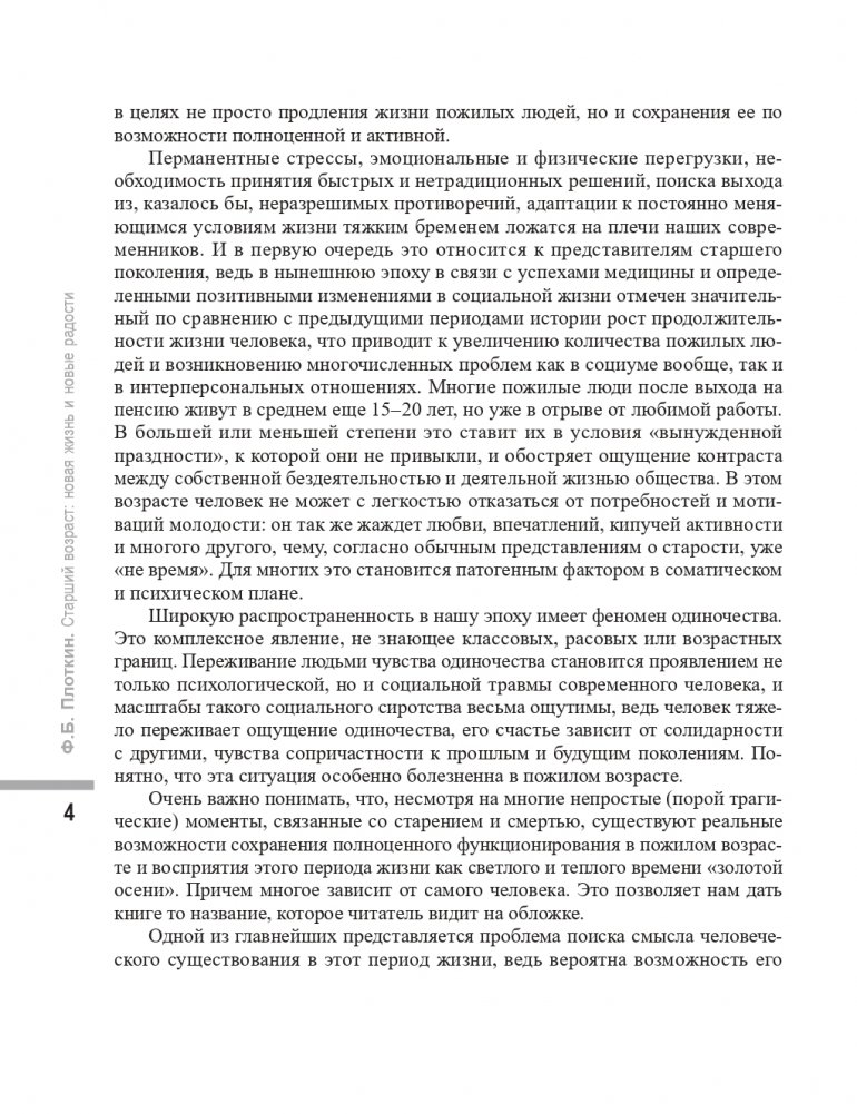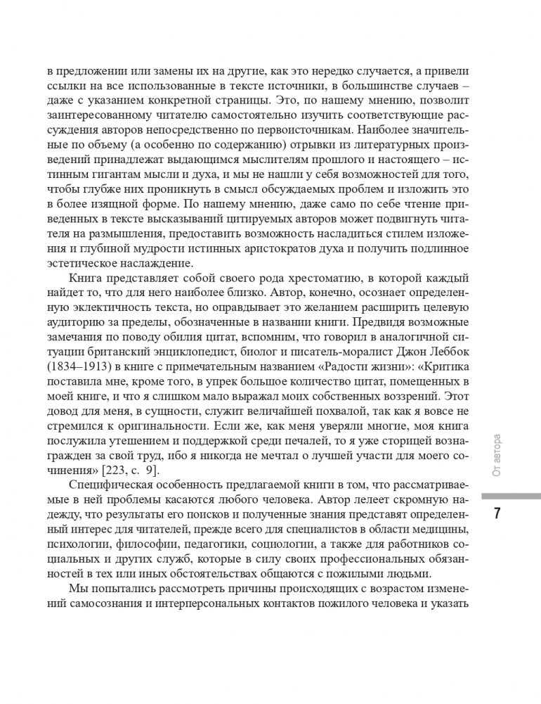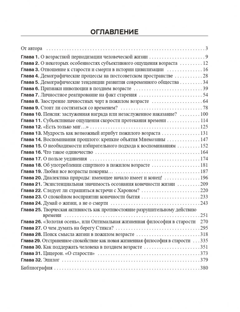 Рассматриваются физиологические, психологические и философские аспекты проблемы старения и личностного реагирования на него. Декларируется необходимость спокойного подведения итогов жизни и формирования собственного отношения к бренности существования. Подчеркивается важность творческой активности личности в противодействии негативным проявлениям старости. Описываются мероприятия, способствующие стабилизации психологического состояния пожилых людей. Обосновываются реальность сохранения полноценного функционирования, возможность плодотворной, радостной и наполненной смыслом жизни в пожилом возрасте, указываются конкретные пути реализации этой возможности.