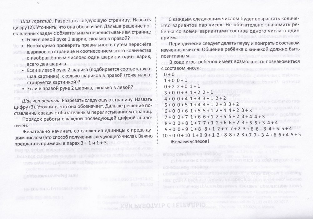 В книжке-игрушке заложен огромный потенциал математической подготовки ребенка к школе. Она поможет ребенку: повторять числа, называя их в прямом и обратном порядке; упражняться в количественном счете; соотносить число с количеством предметов, которое оно обозначает; познакомиться на практическом уровне с разными вариантами состава чисел первого десятка (из двух слагаемых); готовиться к восприятию понятий «прибавить 0», «прибавить 1», «переместительное свойство сложения»; закреплять понятия «левый», «правый».