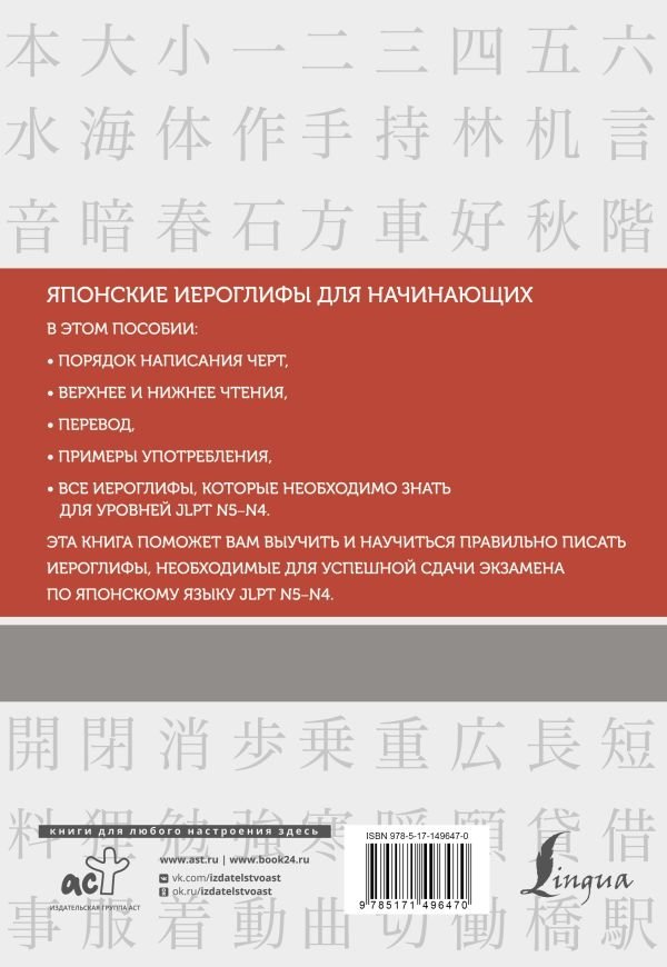 Данное пособие включает в себя все иероглифы, необходимые для успешной сдачи международного экзамена по японскому языку уровней JLPT N5 — N4. К каждому иероглифу даны чтения (верхнее и нижнее), значения и примеры, а также показан правильный порядок написания черт в иероглифах.