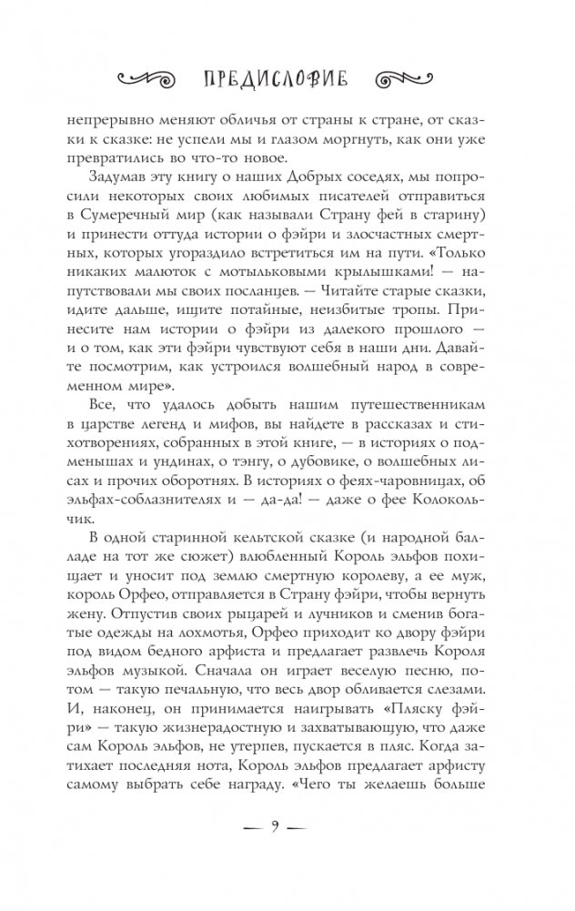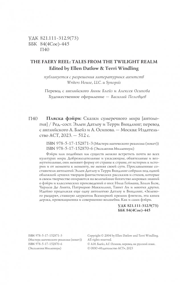 Фэйри или подобных им существ можно встретить почти во всех культурах мира. Доброжелательные и ужасающие, обаятельные и возмутительные, они меняют форму от страны к стране, от истории к истории и от момента к моменту, не меняя своей сути. Прославленные составители антологий Эллен Датлоу и Терри Виндлинг собрали под одной обложкой лучших творцов фантастических рассказов и стихов, которые в своем творчестве опираются на величайшее богатство мировых знаний о фэйри и классических произведений о них: Нила Геймана, Холли Блэк, Чарльза Де Линта, Патрицию Маккиллип, Танит Ли и многих других.