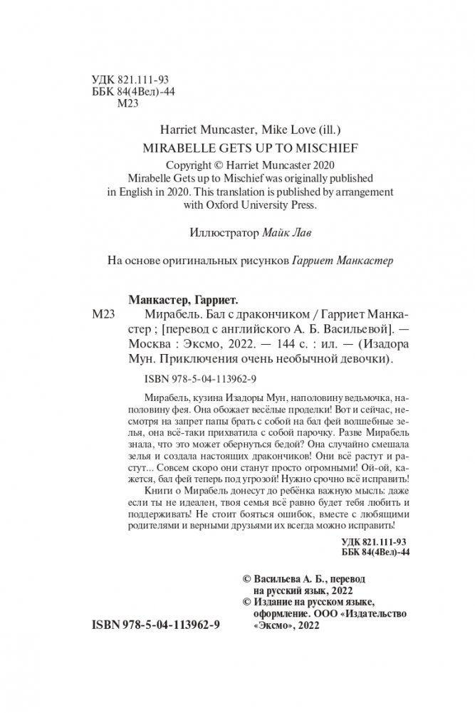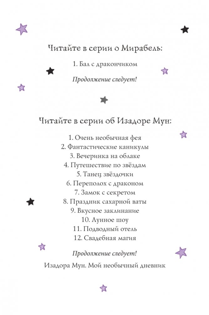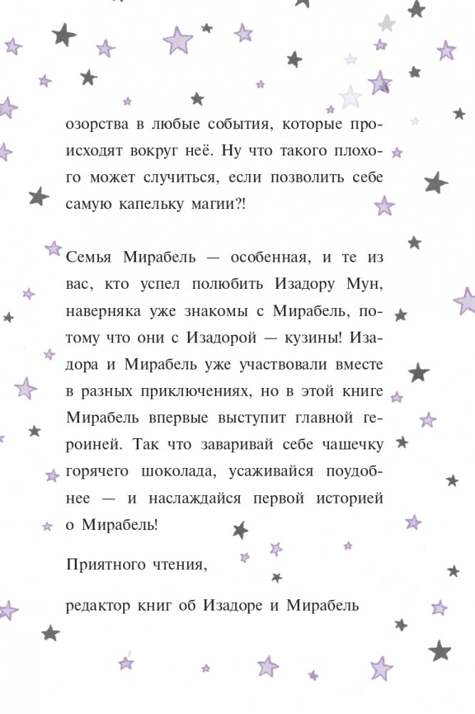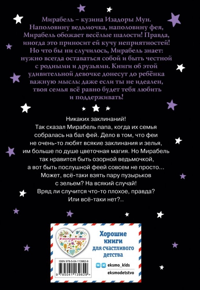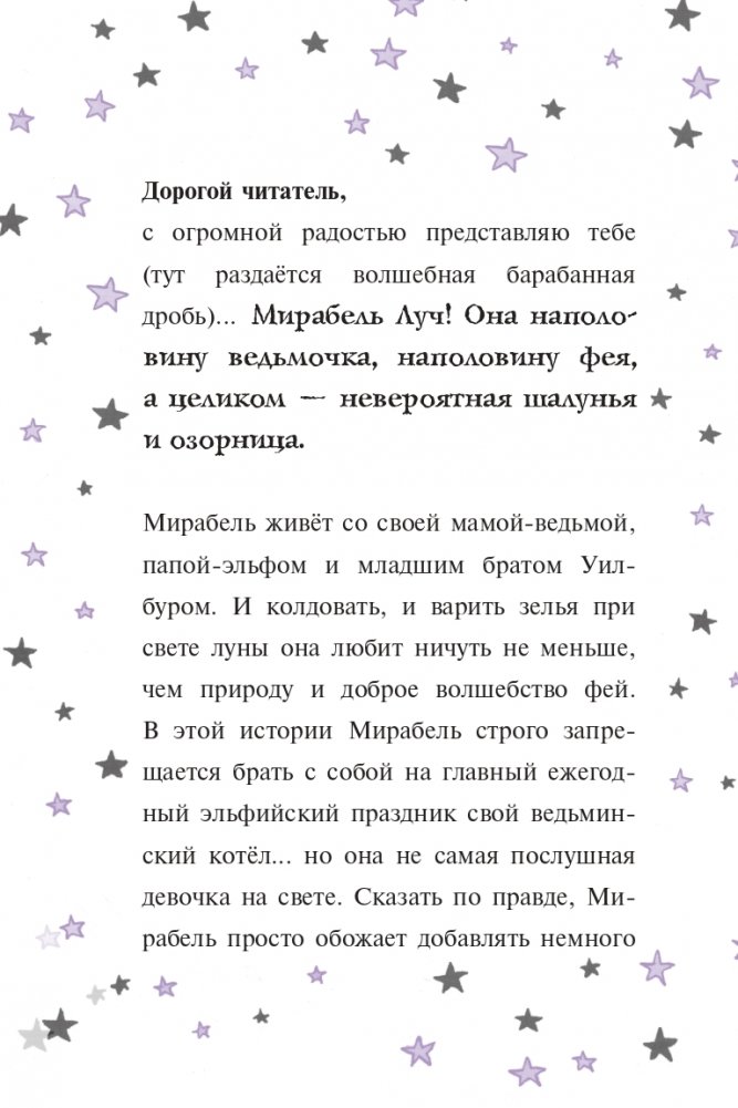 Познакомьтесь с Мирабель, кузиной Изадоры Мун! Наполовину ведьмочка, наполовину фея, она обожает шалости! И иногда из-за этого с ней приключаются разные неприятности. И всё же Мирабель знает: главное — оставаться собой и быть честной с родными и друзьями.