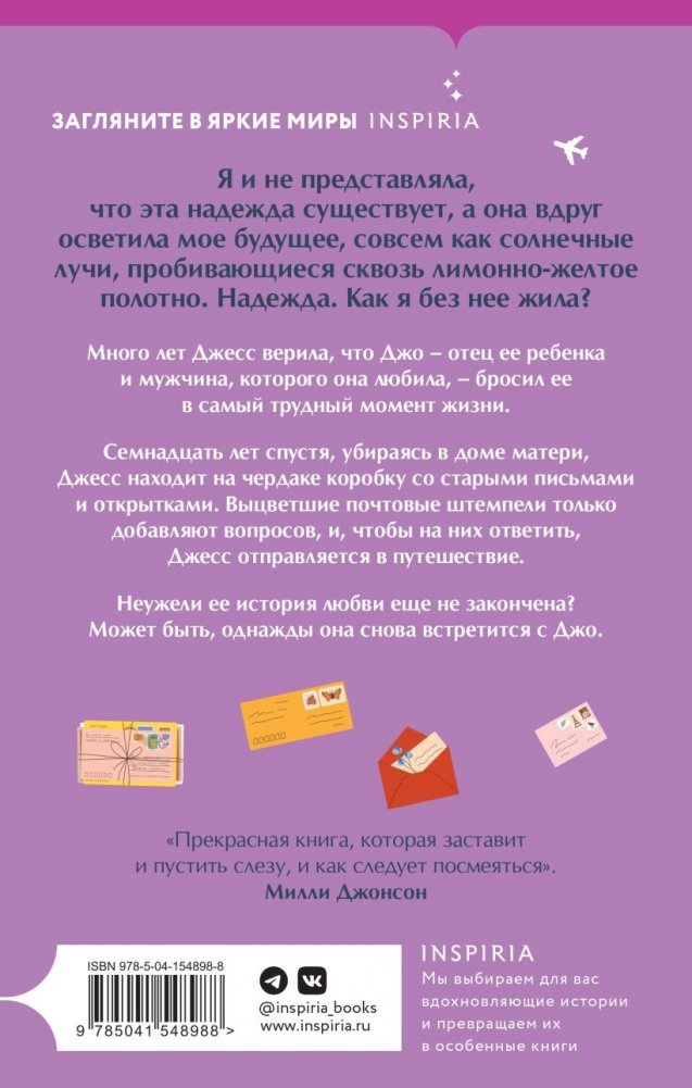 Семнадцать лет спустя, убираясь в доме матери, Джесс находит на чердаке коробку со старыми письмами и открытками. Выцветшие почтовые штемпели только добавляют вопросов, и, чтобы на них ответить, Джесс отправляется в путешествие.