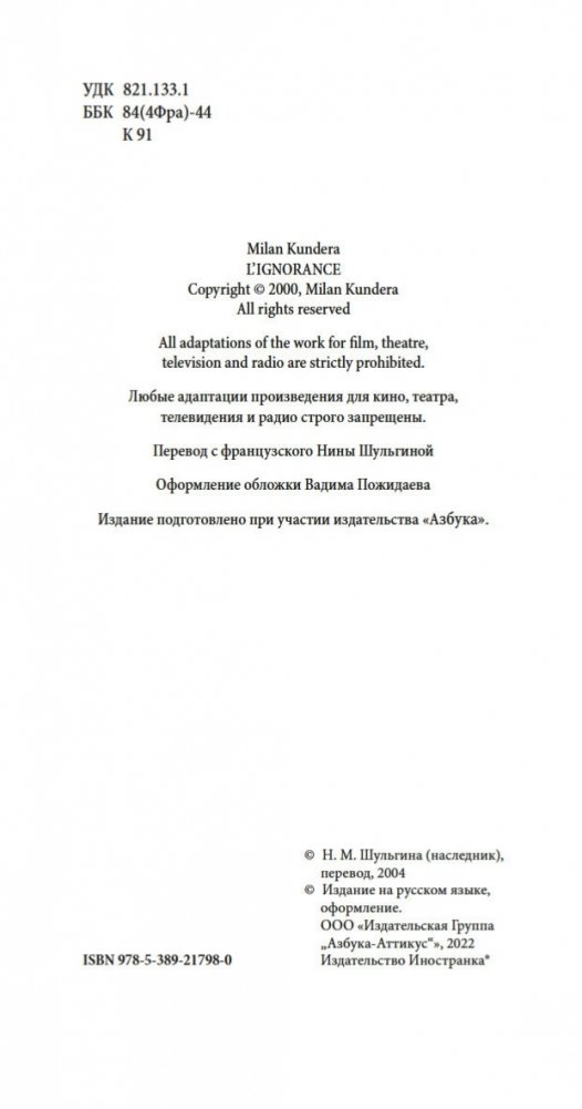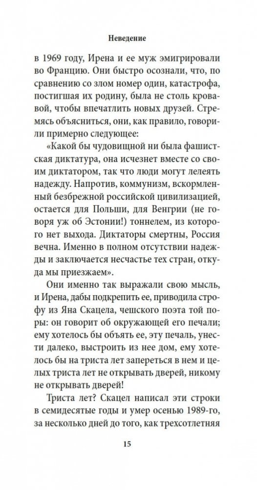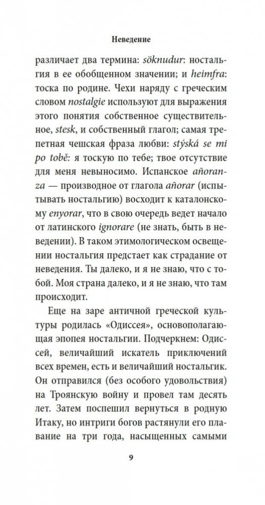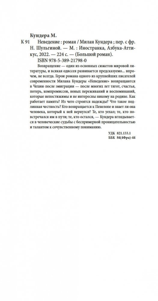 Возвращение — один из основных сюжетов мировой литературы, и всякая одиссея развивается предсказуемо... впрочем, не всегда. Герои романа одного из крупнейших писателей современности Милана Кундеры «Неведение» возвращаются в Чехию после эмиграции — после многих лет тягот, счастья, потерь, компромиссов, новых переживаний и воспоминаний, которые непостижимы и не интересны никому на родине. Как работает память? Из чего строятся надежды? Что такое подлинная честность? Кто возвращается к Пенелопе и знает ли она человека, который к ней вернулся? Те, кто уехал; те, кто повстречался им в пути; те, кто остался, — Кундера вглядывается в человеческие судьбы с беспримерной проницательностью и талантом к сочувственному пониманию.