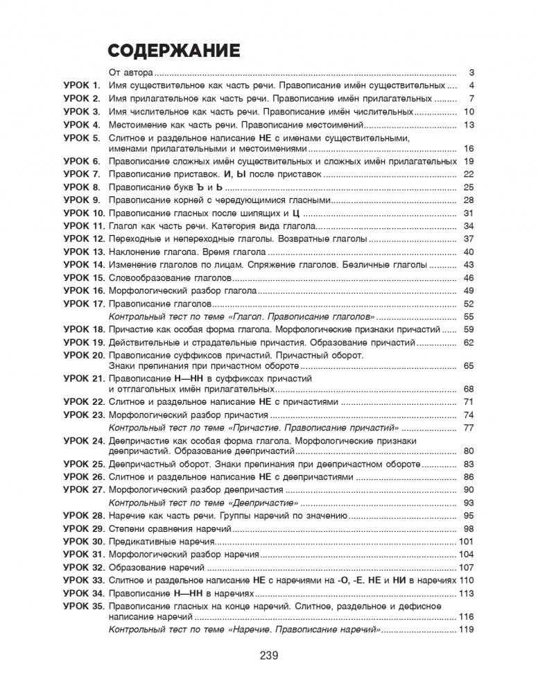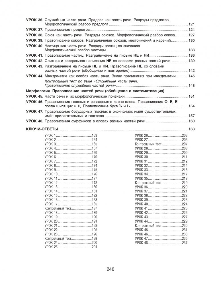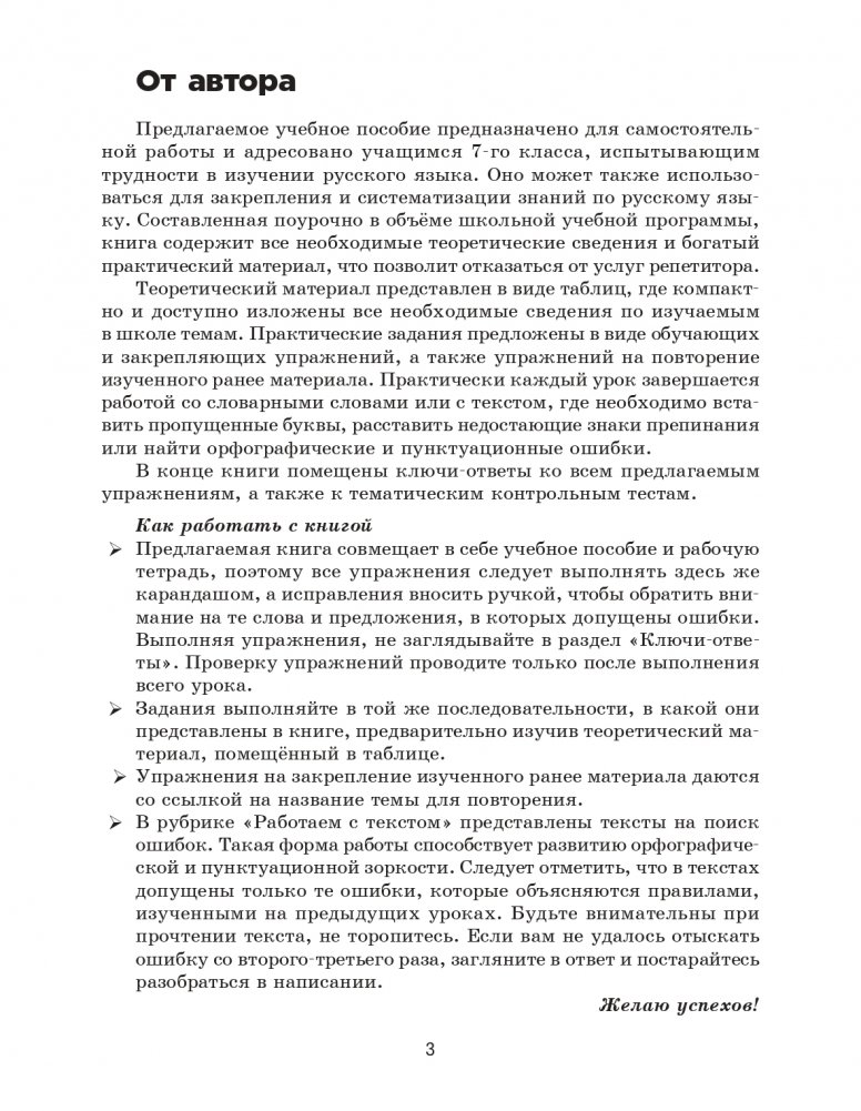 Книга адресована учащимся 7 класса, испытывающим трудности в изучении русского языка. Она составлена так, чтобы ребенок мог сам легко и быстро усвоить материал школьной программы. Пособие содержит все необходимые теоретические сведения и разнообразные практические задания, тем самым совмещая в себе учебное пособие и рабочую тетрадь, поэтому все упражнения можно выполнять прямо в книге. Здесь же приводятся ключи-ответы ко всем упражнениям и тестам. Новая редакция содержит существенные улучшения и дополнения и еще ближе к школьной программе.