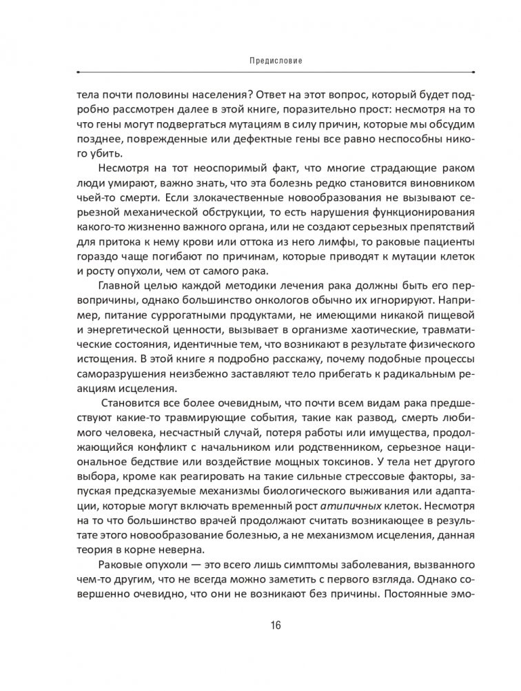Книга познакомит вас с совершенно новым представлением о раке — в сравнении с которым традиционный подход к онкологическим заболеваниям выглядит безнадежно устаревшим. Консервативные методы лечения, основанные на уничтожении, вырезании или выжигании раковых клеток, позволяют добиться ремиссии лишь у 7% пациентов, и в подавляющем большинстве случаев такое «выздоровление» продлевает жизнь максимум на 5 лет. Андреас Мориц показывает всем нам: