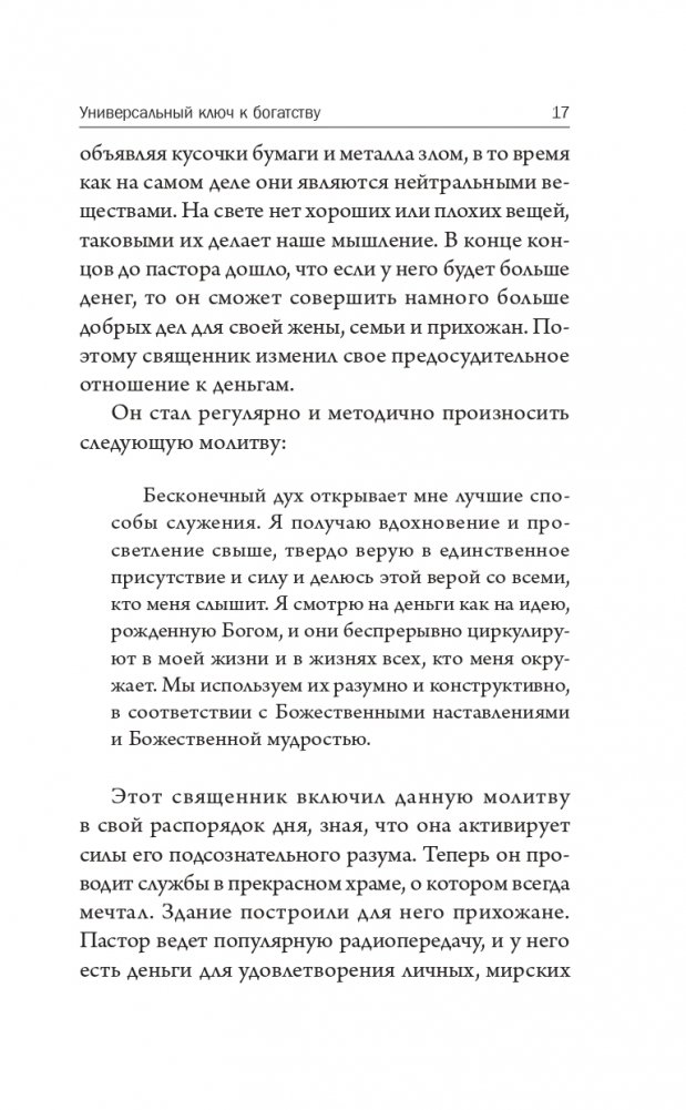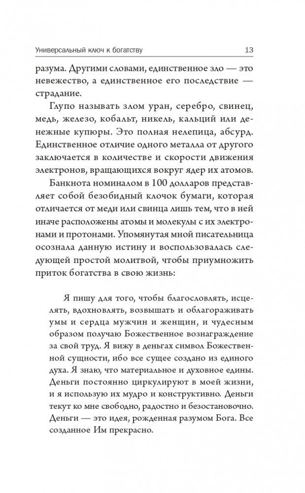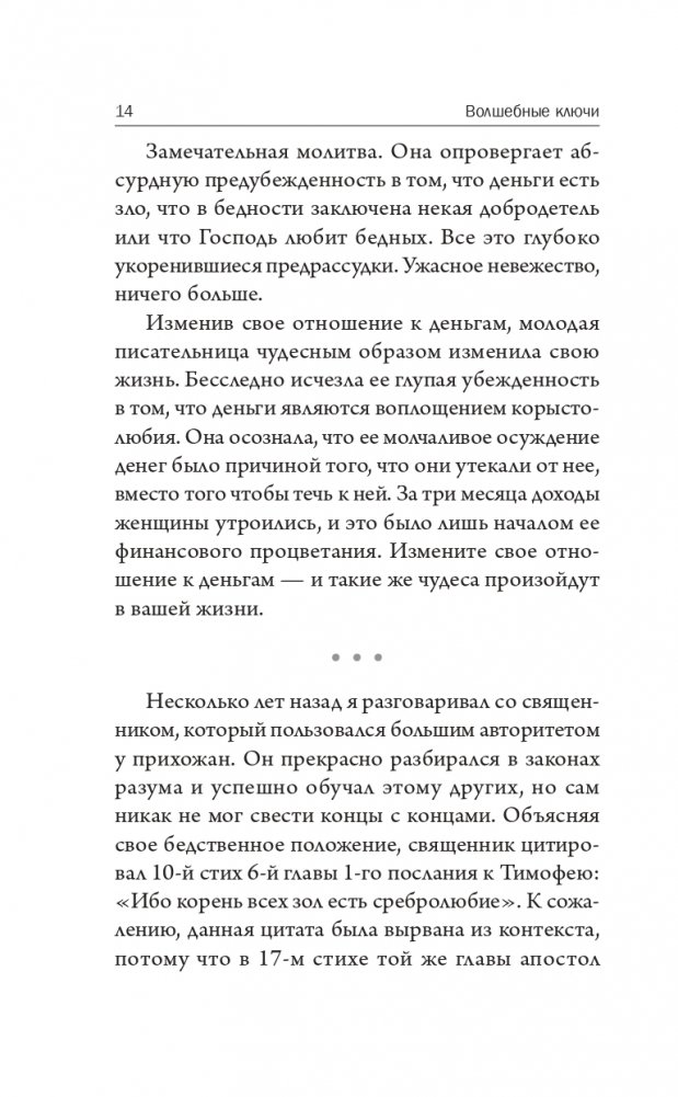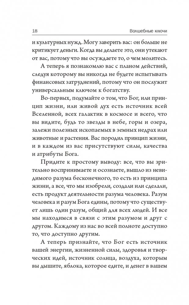 Сборник «Волшебные ключи» включает восемь увлекательных лекций и эссе, призванных помочь нам сформировать менталитет, необходимый для удовлетворения наших потребностей в здоровье, богатстве, душевном покое, безопасности и изобилии. Для этого мы должны осознать присутствие в нас всемогущей божественной силы бесконечного интеллекта, желающего нам процветания во всех наших начинаниях.