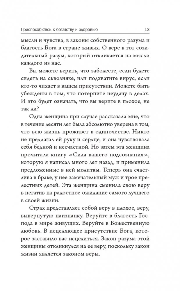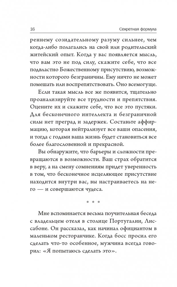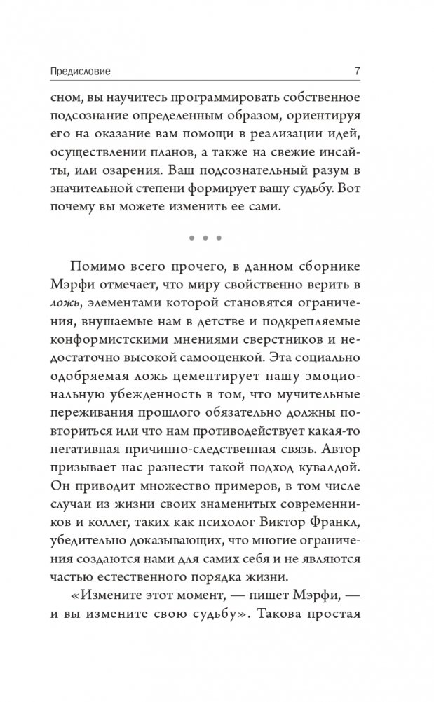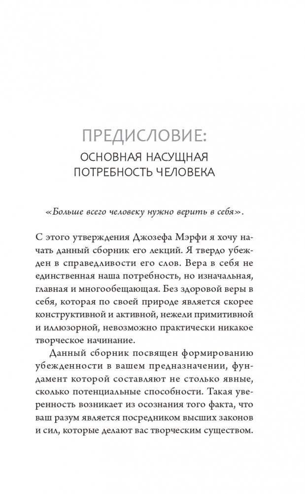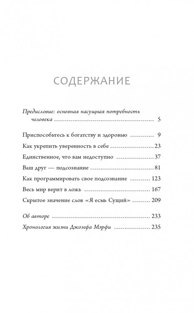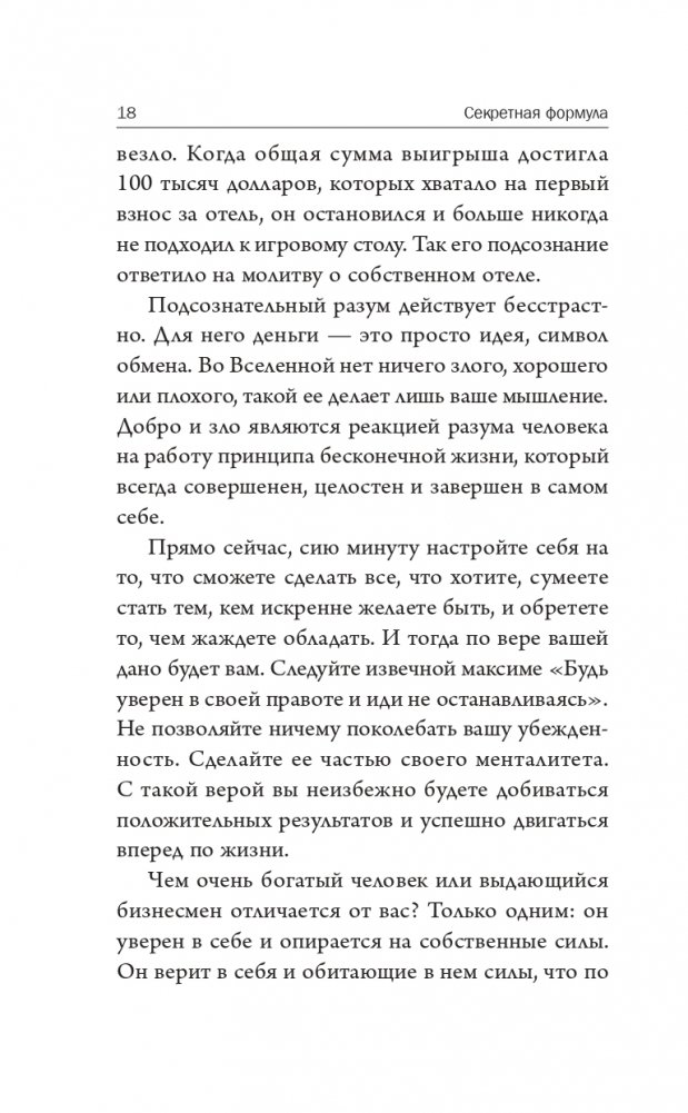 В простых и убедительных идеях Джозефа Мэрфи содержится мощный духовный посыл — секретная формула использования метафизической силы мыслей и связи человеческого разума с высшим созидательным принципом Вселенной. Когда вы откроете для себя эту эзотерическую истину, то сможете оценить свой реальный потенциал и привести свою жизнь в соответствие с высшим предназначением.