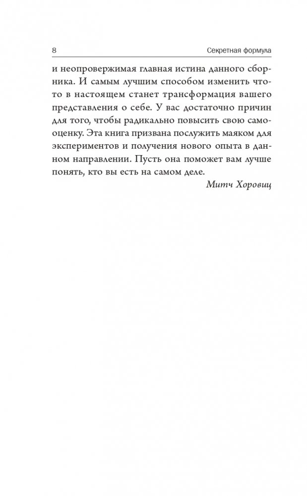 Здоровая самооценка — единственный определяющий фактор успеха. К сожалению, многим из нас ее не хватает. В этом сборнике вам предлагается скрытый ключ к осознанию своей истинной сущности и бесконечных возможностей разума.