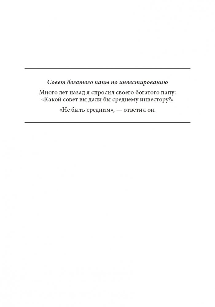 Разные люди подразумевают под инвестированием разные вещи. На самом деле существуют инвестиции для богатых, бедных и среднего класса. Эта книга представляет собой рассчитанное на долгий срок руководство для всех, кто хочет стать по-настоящему богатым инвестором. Знаменитый Роберт Кийосаки расскажет вам: