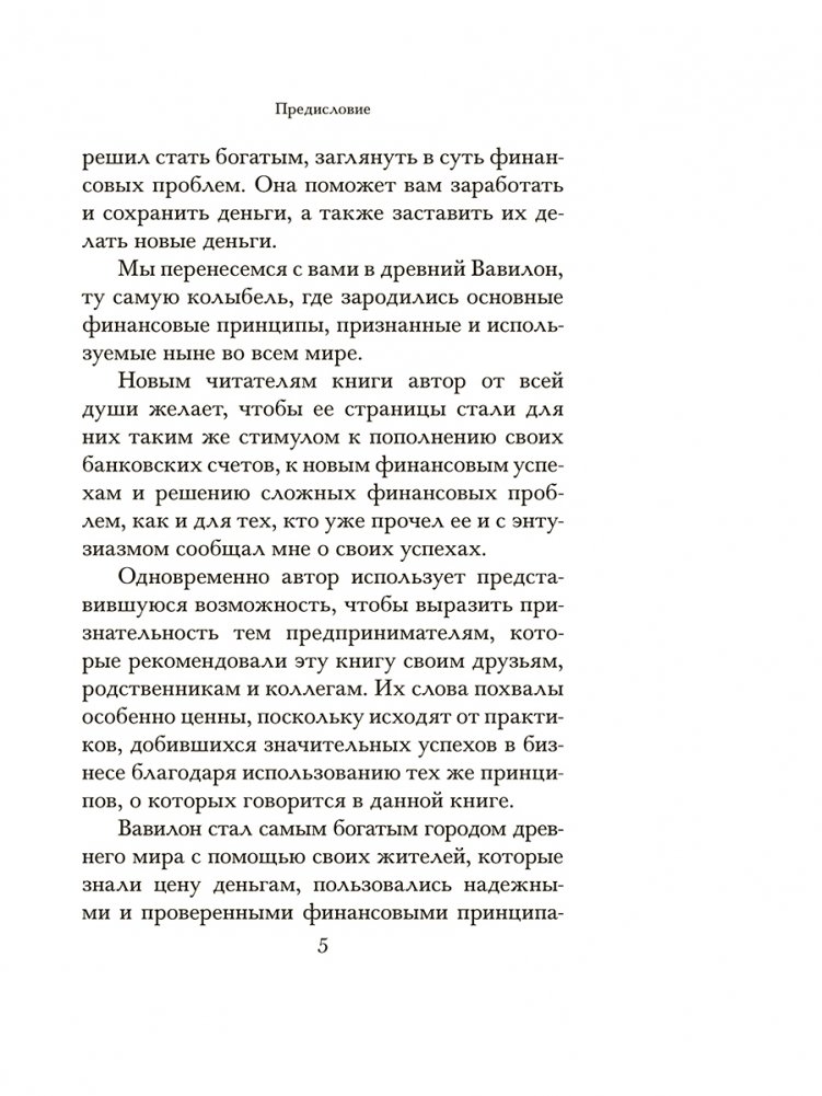 Будущее простирается перед нами подобно ведущей вдаль дороге — дороге наших неосуществленных замыслов и несбывшихся желаний. Чтобы исполнить все свои мечты, вы непременно должны добиться успеха в денежных вопросах. С помощью предложенных в этой книге финансовых принципов вы сможете сделать свою жизнь более насыщенной и счастливой, что возможно только в том случае, если ваш кошелек будет полон. Эти финансовые принципы универсальны и неизменны. Они докажут вам свою действенность так же, как доказали ее многим другим, став ключом к стабильному финансовому прогрессу и процветанию.