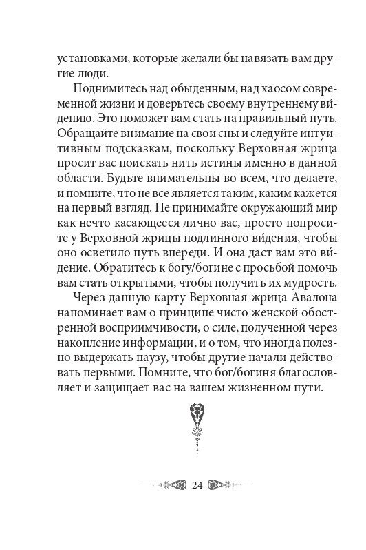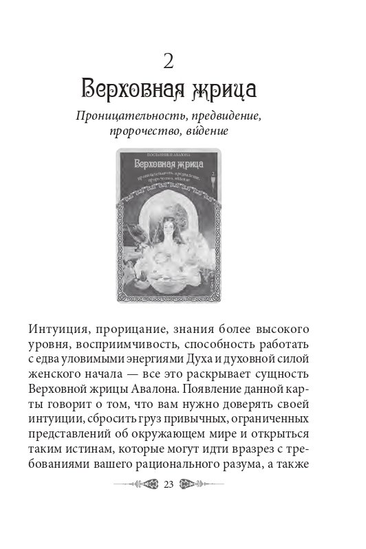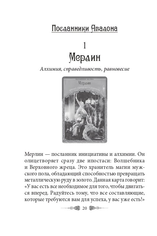 Карты прольют свет на то, что было в прошлом, что нужно осознать в настоящем и что следует вплести в полотно будущего. С их помощью вы откроете потенциал собственной интуиции, если будете следовать подсказкам, посылаемым в виде разных знаков и символов обитателями магического острова Авалон.