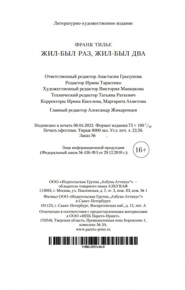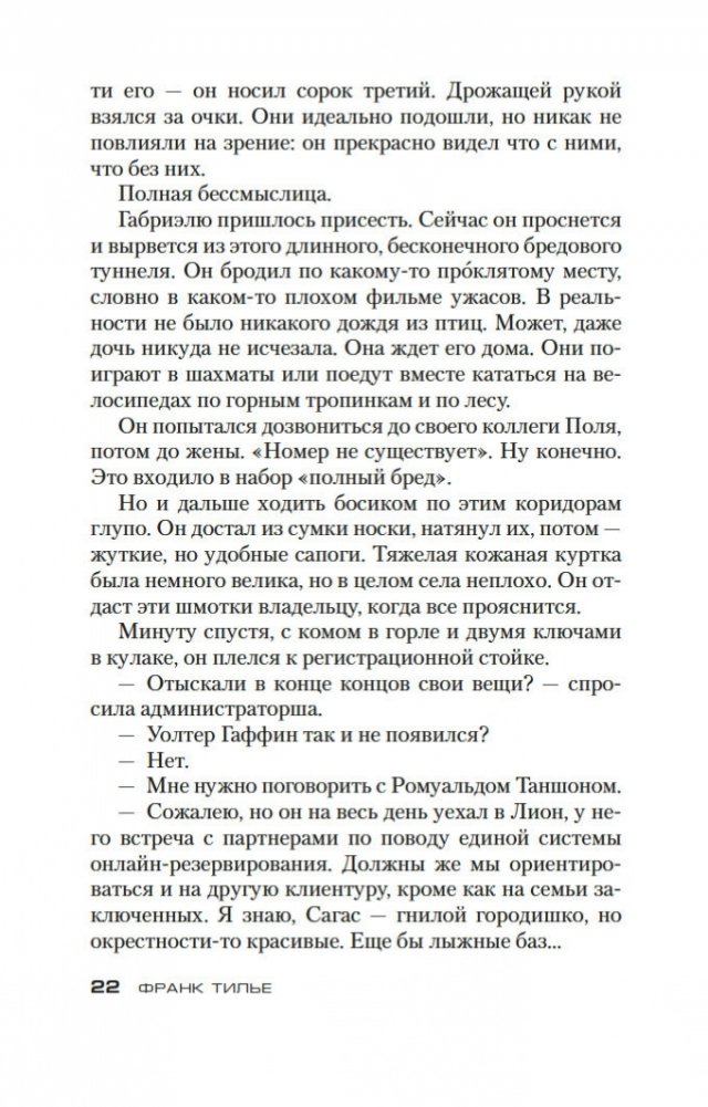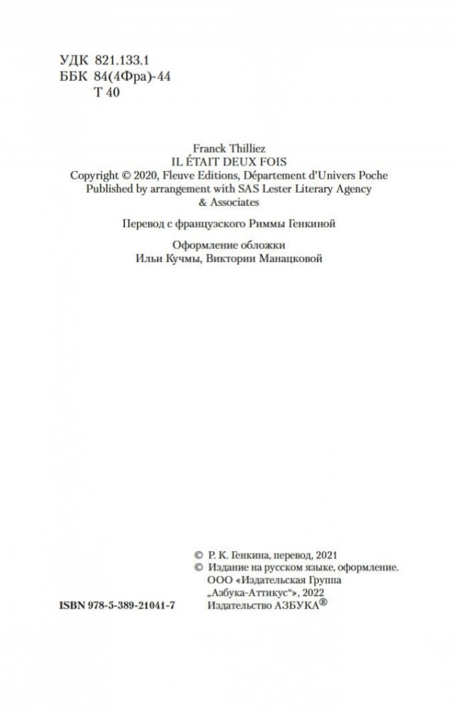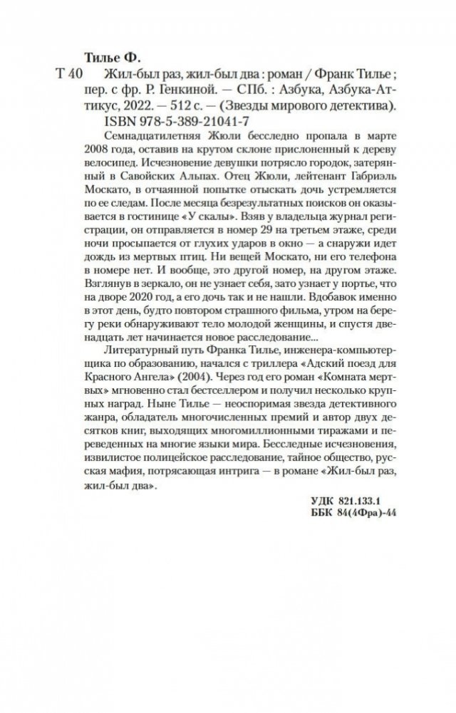 Литературный путь Франка Тилье, инженера-компьютерщика по образованию, начался с триллера «Адский поезд для Красного Ангела» (2004). Через год его роман «Комната мертвых» мгновенно стал бестселлером и получил несколько крупных наград. Ныне Тилье — неоспоримая звезда детективного жанра, обладатель многочисленных премий и автор двух десятков книг, выходящих многомиллионными тиражами и переведенных на многие языки мира. Бесследные исчезновения, извилистое полицейское расследование, тайное общество, русская мафия, потрясающая интрига — в романе «Жил-был раз, жил-был два».