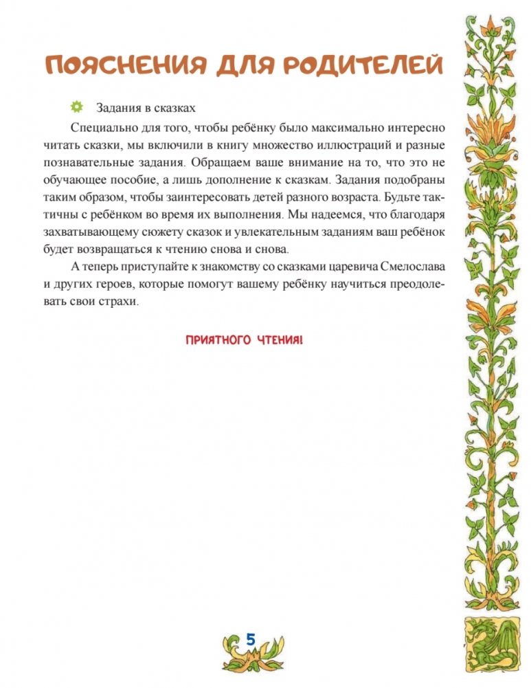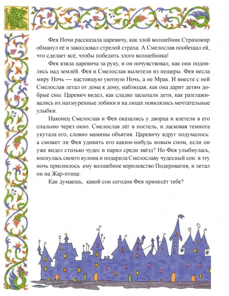Эта книга из цикла «Сказки для Умнички» рассказывает о приключениях маленького, но очень храброго Царевича Смелослава, победившего Ночного Дракона и спасшего Фею Добрых Снов.