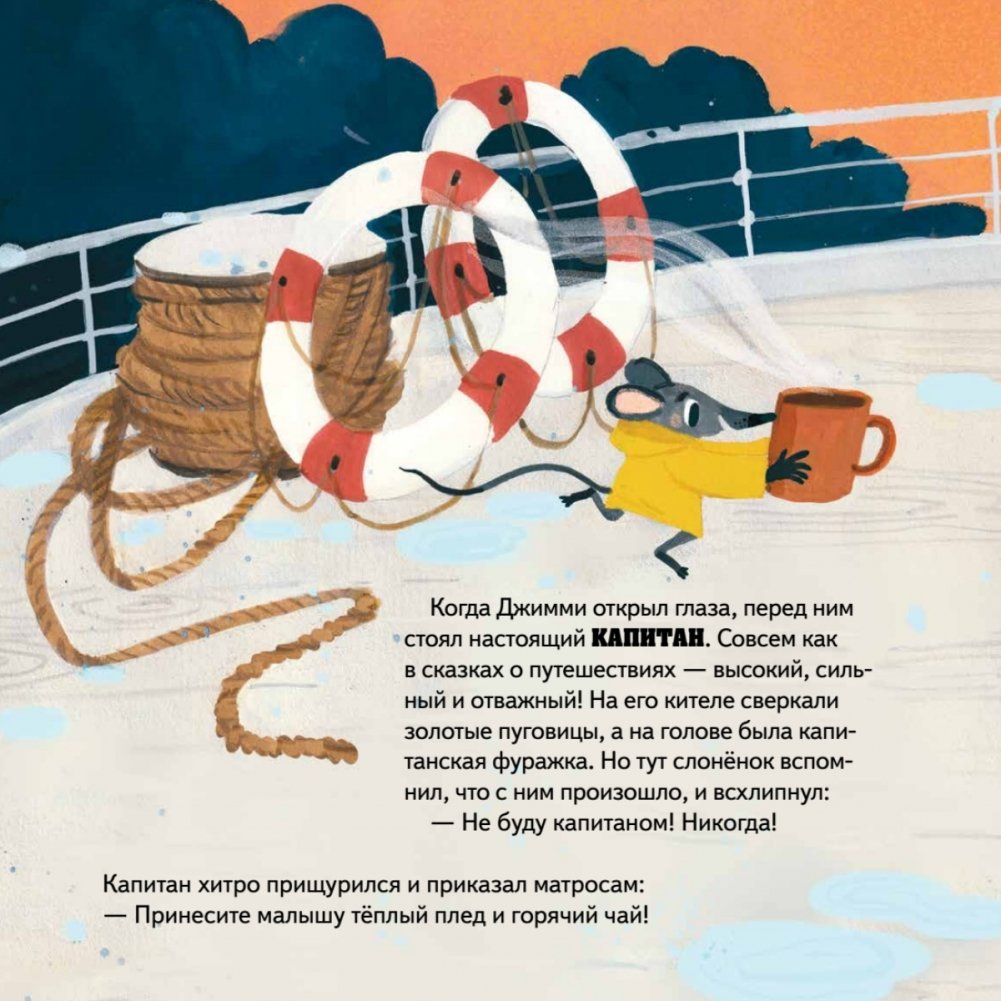 Сложно быть таким маленьким слонёнком и иметь такую большую мечту! Но Джимми очень хотелось стать настоящим капитаном. Каждый день он тренировался и запускал в ручейке бумажный кораблик. Однажды случилось несчастье и Джимми оказался один на плоту посреди бушующего океана. Кто же придёт ему на помощь? Сможет ли слонёнок вновь поверить в себя?